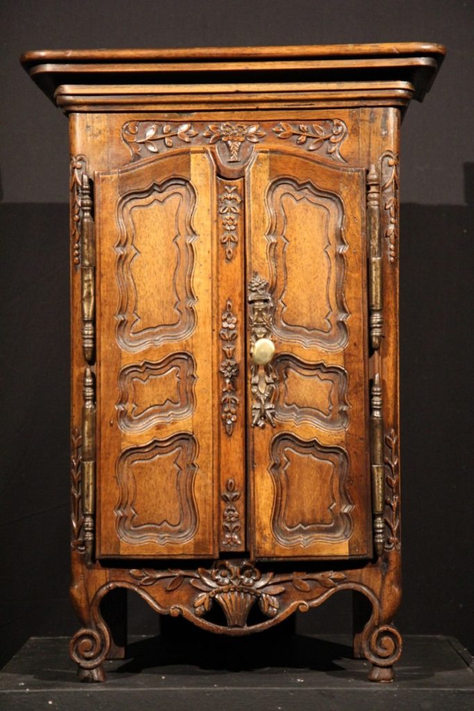 Small master piece of furniture representing a Provençal wedding armoire (wardrobe). Walnut wood. First half of the 19th century.