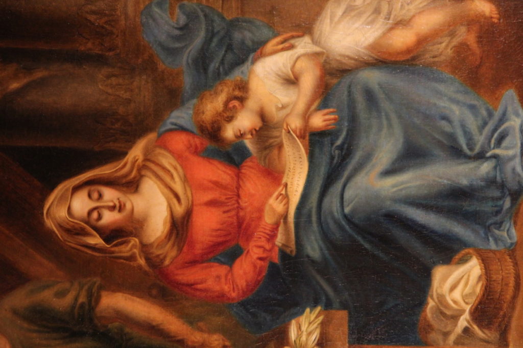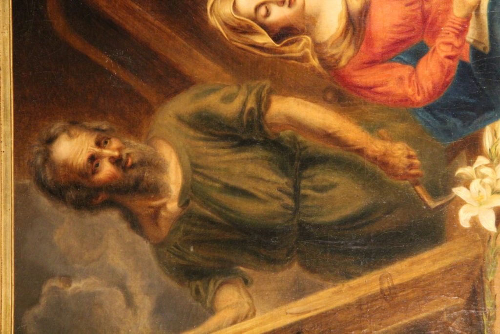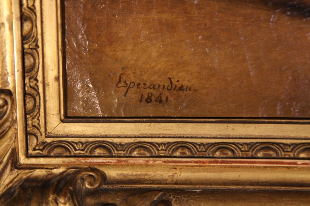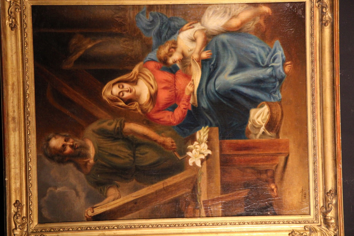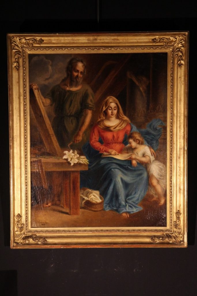 Oil on canvas. 19th-century Provençal school. The Holy Family, signed Esperandieu and dated 1841. Joseph, carpenter, Mary educating the child Jesus, lilies symbols of purity.