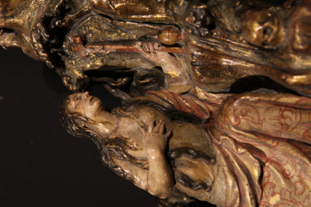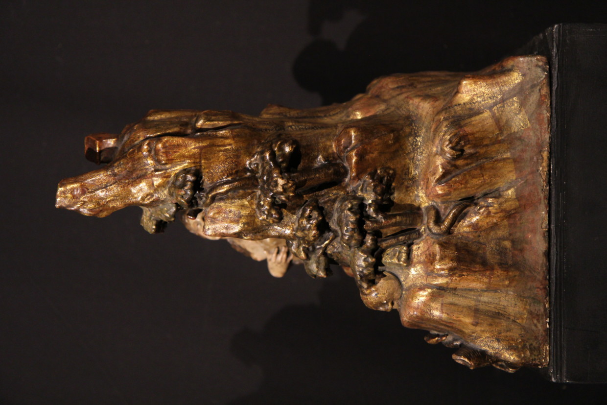 St. Mary Magdalene penitent. Sculpture in polychrome and gilded terracotta. The saint, in prayer, is kneeling before a crucifix that she holds with her left hand. The surrounding decor evokes the cave (baume) where she lived the end of her days. Note the ointment vase (her attribute) and a skull, a symbol of vanity. A small chapel is depicted on the rock that recalls the one built at the top of the Ste Baume mountain in St Maximin, Provence.
