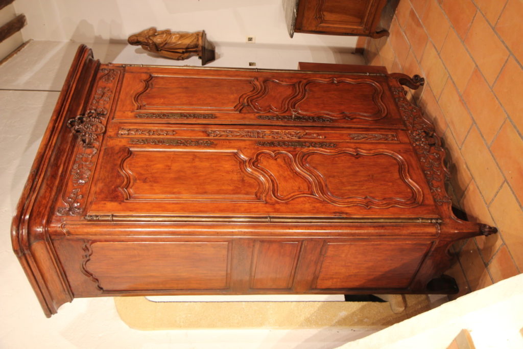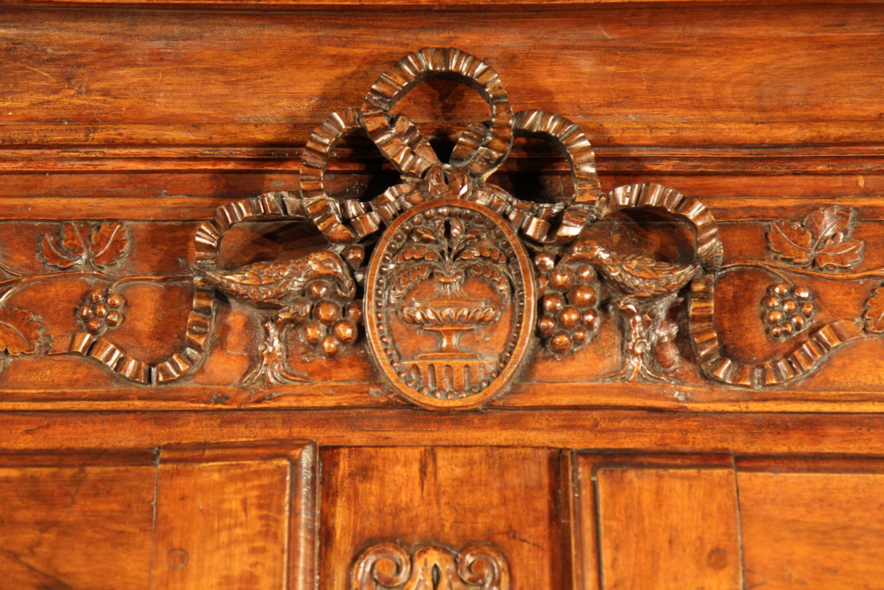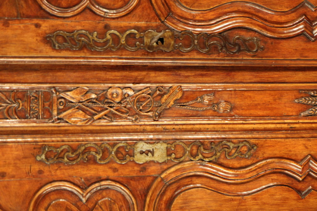 18th C Provençal wedding armoire (wardrobe). According to tradition, the front is richly carved with vine branches, wedding ribbons, and a pair of doves on the pediment; musical instruments and ears of wheat on the piece between the doors; and finally, a basket of fruit and oak branches garnished with acorns on the low crossbar.
