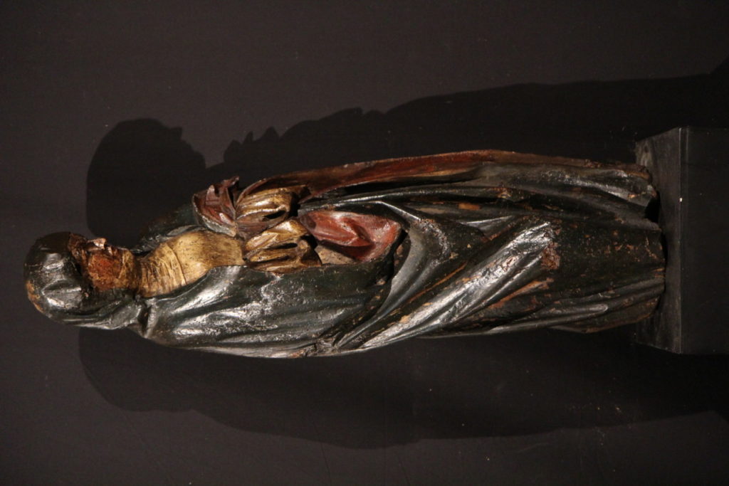 Virgin of Sorrows. Carved and polychrome lime wood statue with hollowed-out back. Dressed in a cloak veil, she wears a wimple; her face, marked by sadness, is inclined towards the dead Christ. This statue was probably part of a sepulchre or a calvary.