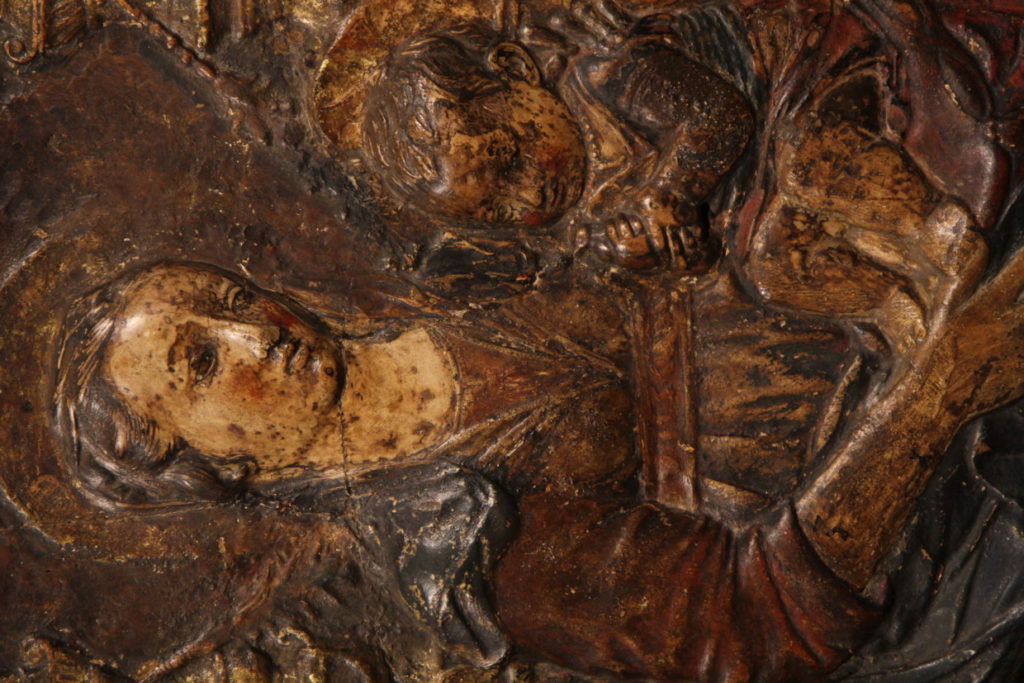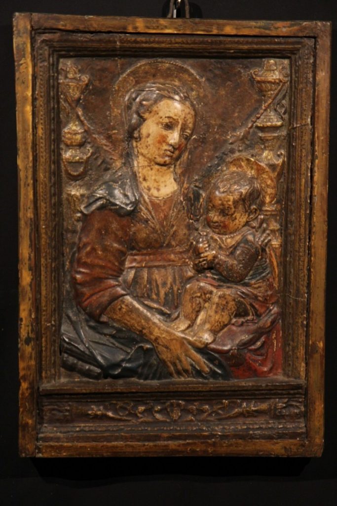 16th-c Florentine school. Virgin and Child. Bas-relief in polychrome cartapesta.