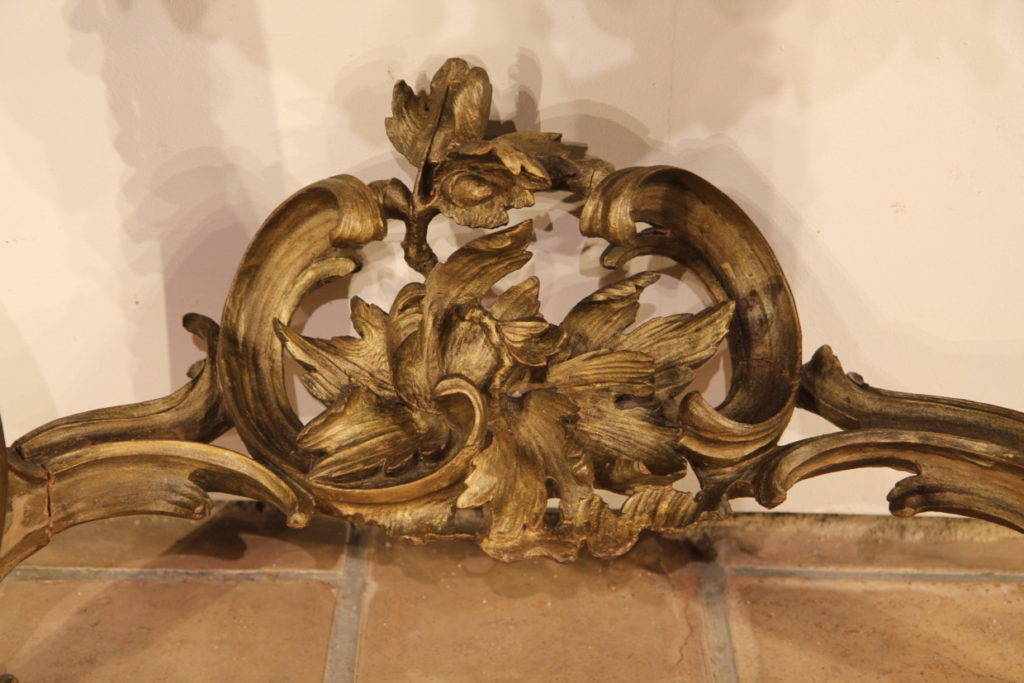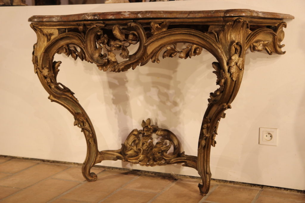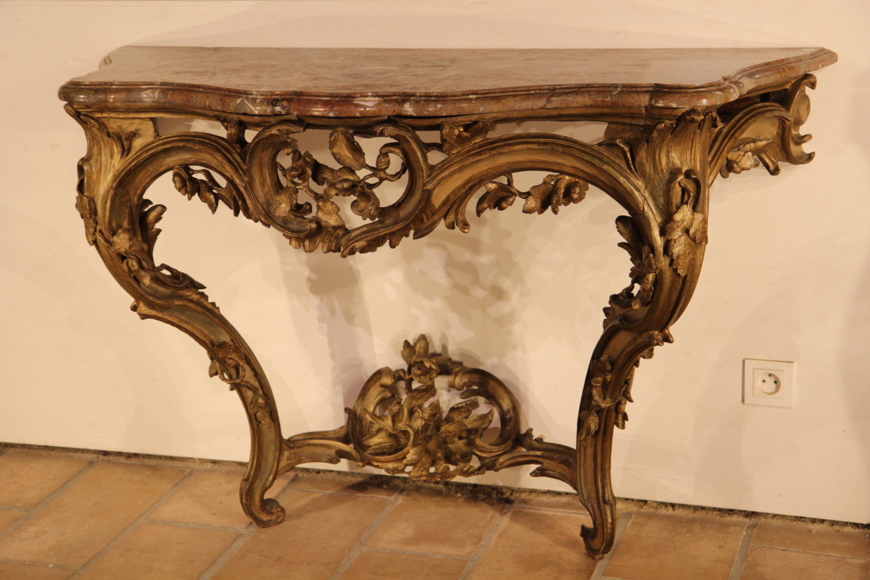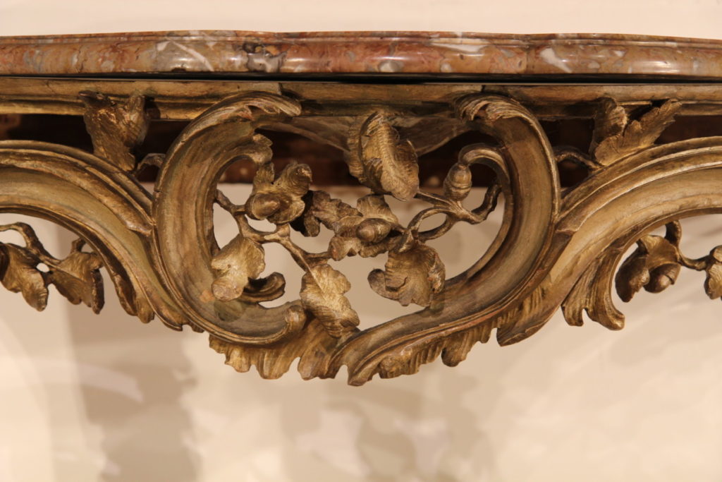 18th C Louis XV Console in carved, gilt and lacquered wood. Rich openwork decoration of foliage, oak acorns and acanthus leaves. Turquin of Caunes incarnate marble top with traces of calcite. This original marble, with moulded edge, follows the console curves.