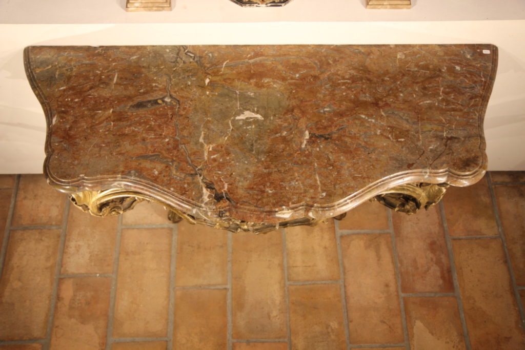 18th C Louis XV Console in carved, gilt and lacquered wood.
