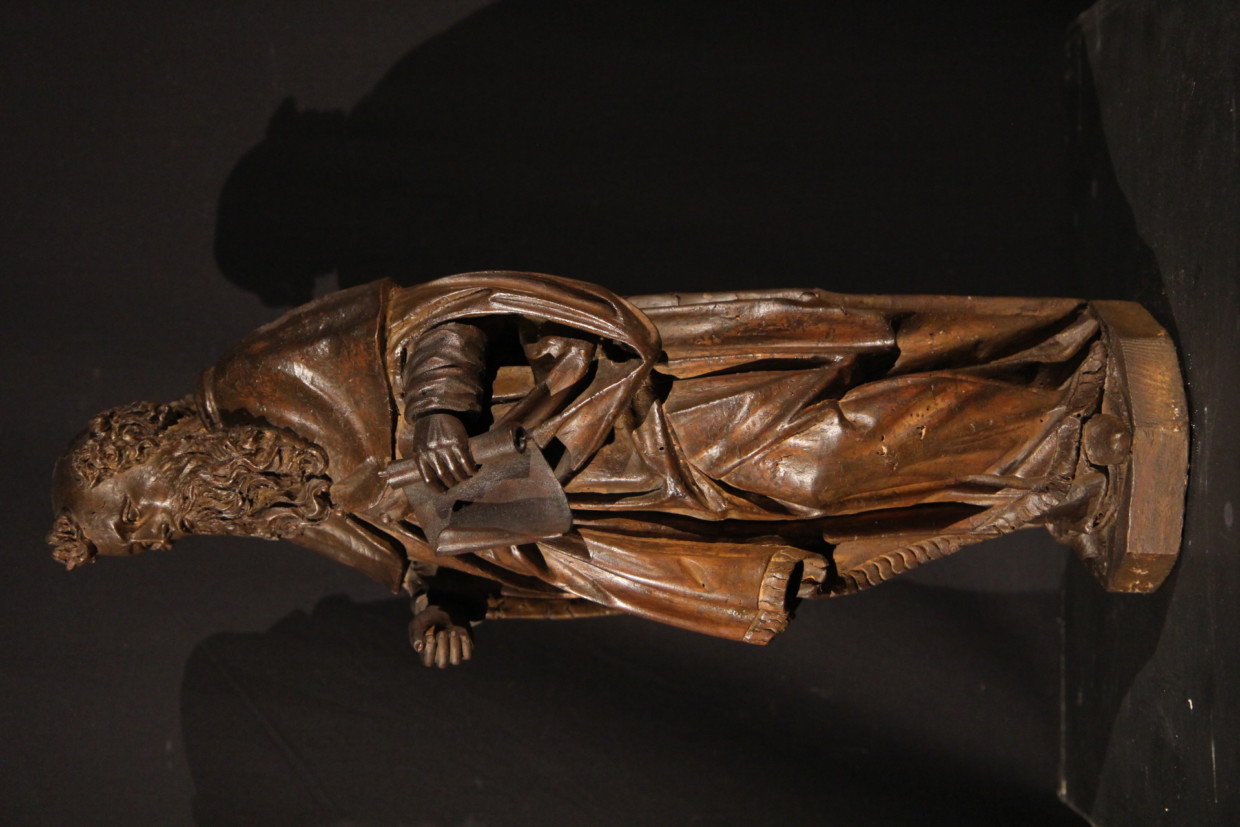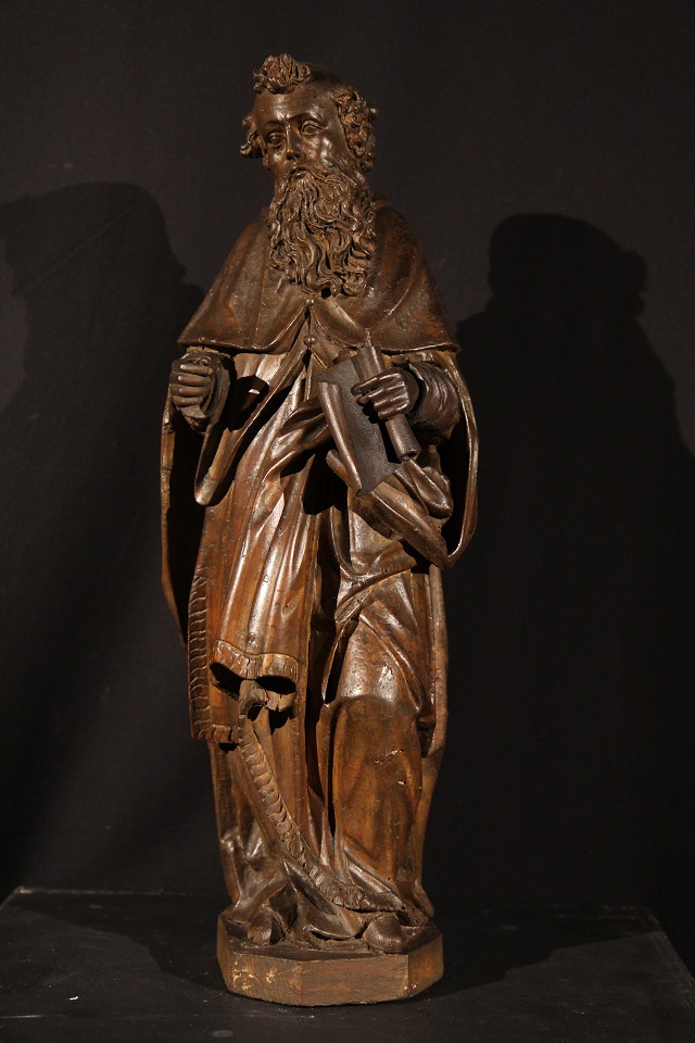 Saint Paul. 17th C Statuette in finely carved walnut wood. Richly dressed in an alb covered with a coat surmounted by the mozzetta, he holds the epistles with his left hand. The rigth hand probably held a sword, symbol of his martyrdom. According to tradition, he wears a beautiful very full beard, his head being rather bald.