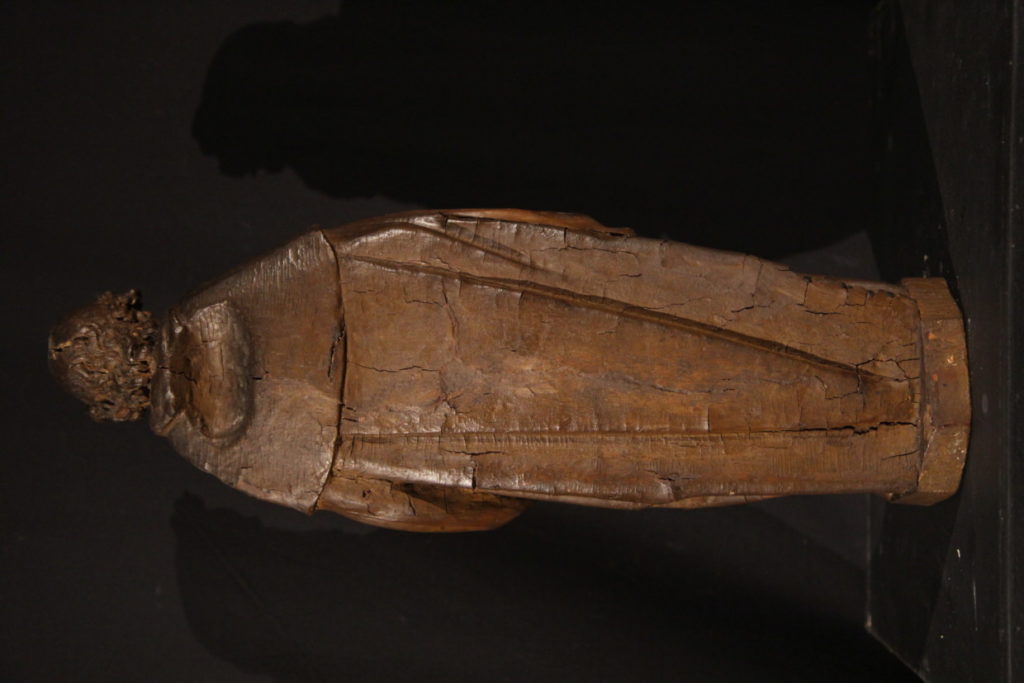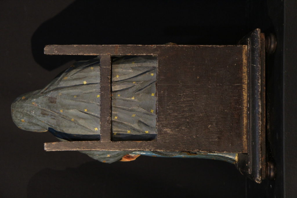 Crowned Virgin and Child. Statue in carved softwood with traces of polychromy. The Virgin, slightly off-balance, holds the dressed Child on her left arm with her right hand holding her coat. The faces, with fine features, express all the tenderness between the mother and her son.