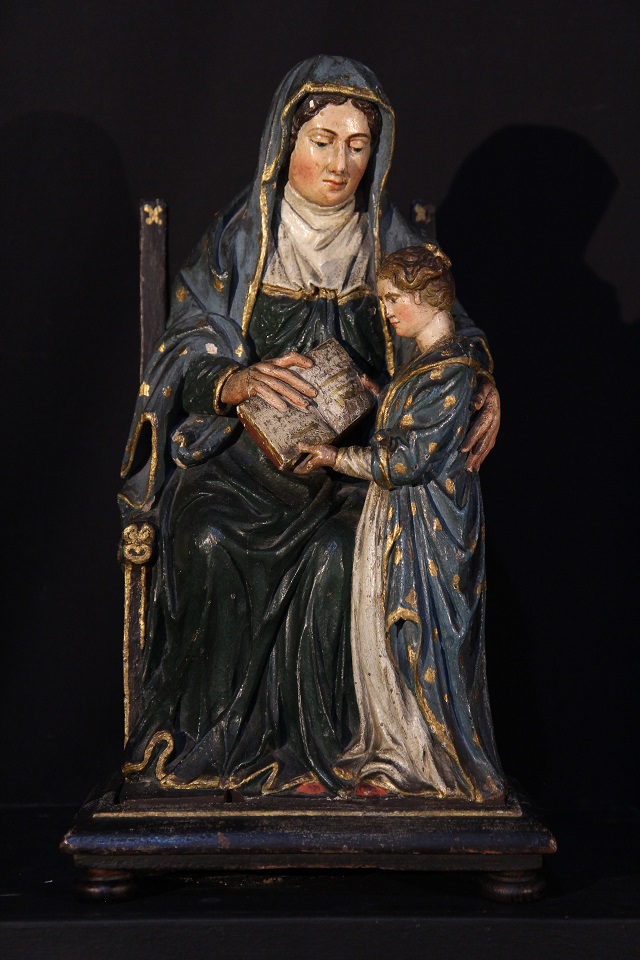 Late 16th C-early 17th C Group in carved and polychrome oak wood representing the Education of the Virgin. Saint Anne seated presents the open book to her daugther, the Virgin, who is standing. In a gesture of affection and protection, she puts her hand on her shoulder.