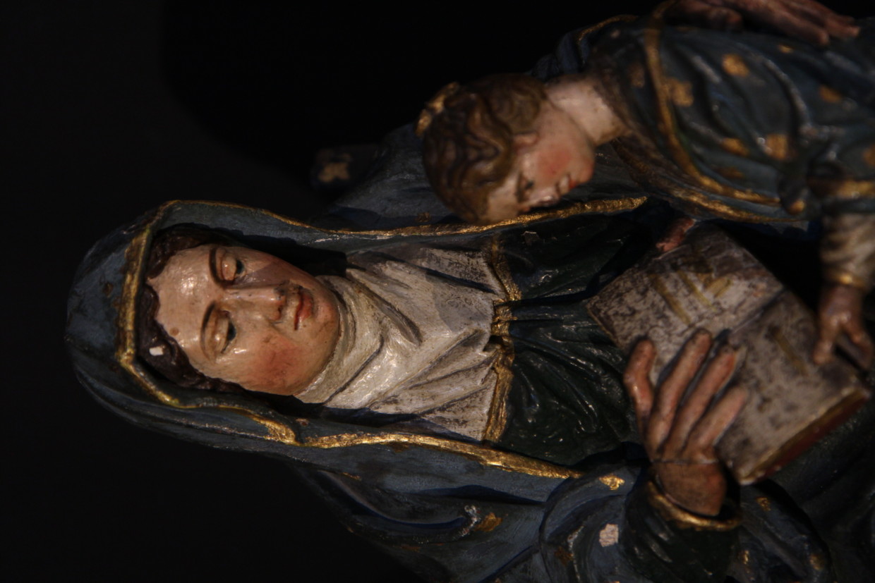 Late 16th C-early 17th C Group in carved and polychrome oak wood representing the Education of the Virgin. Southern France work. Sold.