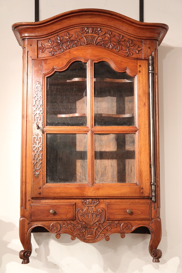 Late 18th C “Verriau” from Provence. Small showcase to hang. Arlesian model with its carved decoration of foliage , small scroll feet , curved cornice.