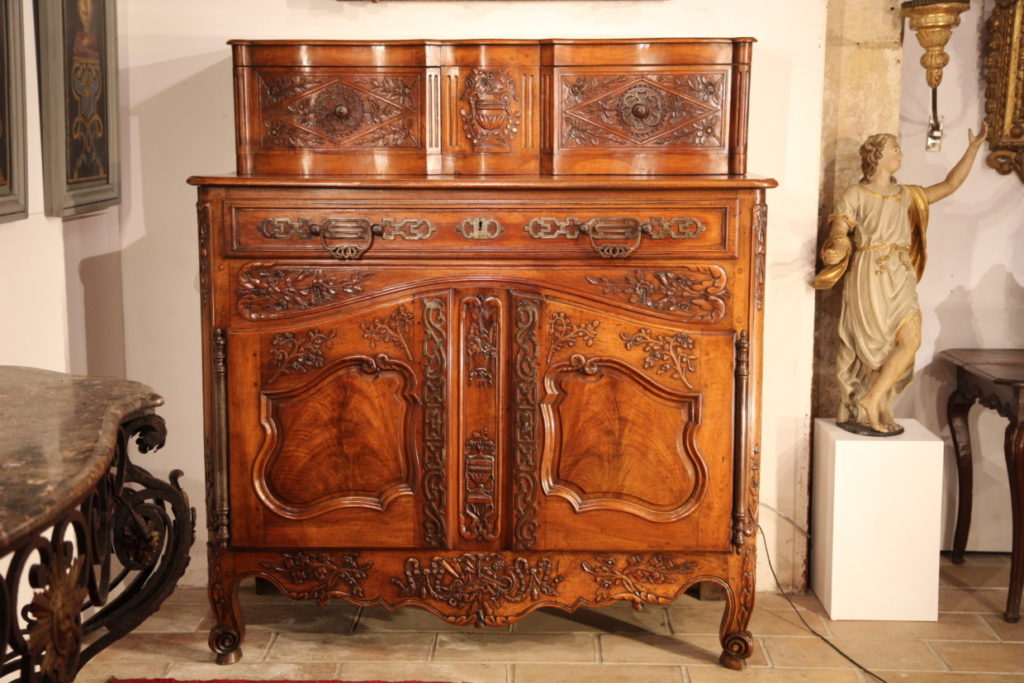 Late 18th C Buffet (sideboard) with sliding doors upperpart. Typical provencal piece of furniture. The low part comprises 2 doors and a drawer. Richly carved front with a decoration of urns, musical instruments, bunches of flowers, ribbons and pearl necklace. Period important ironwork which is part of decoration. In walnut wood.