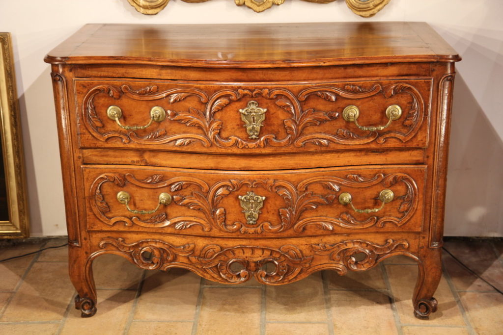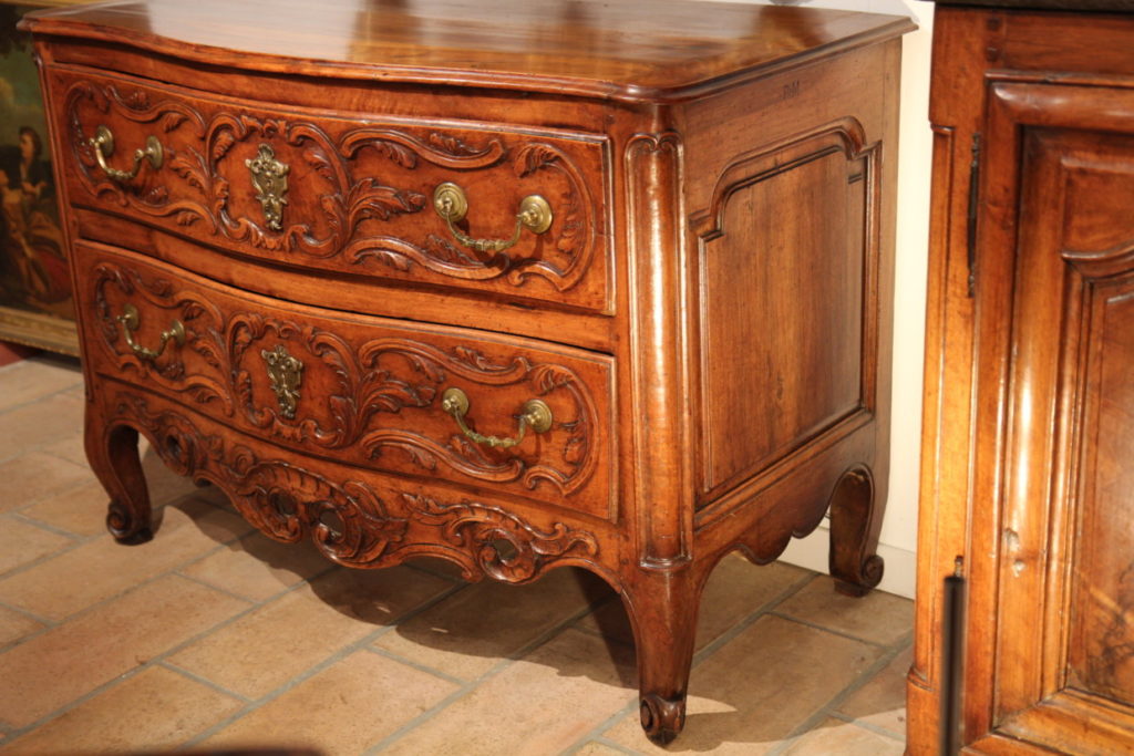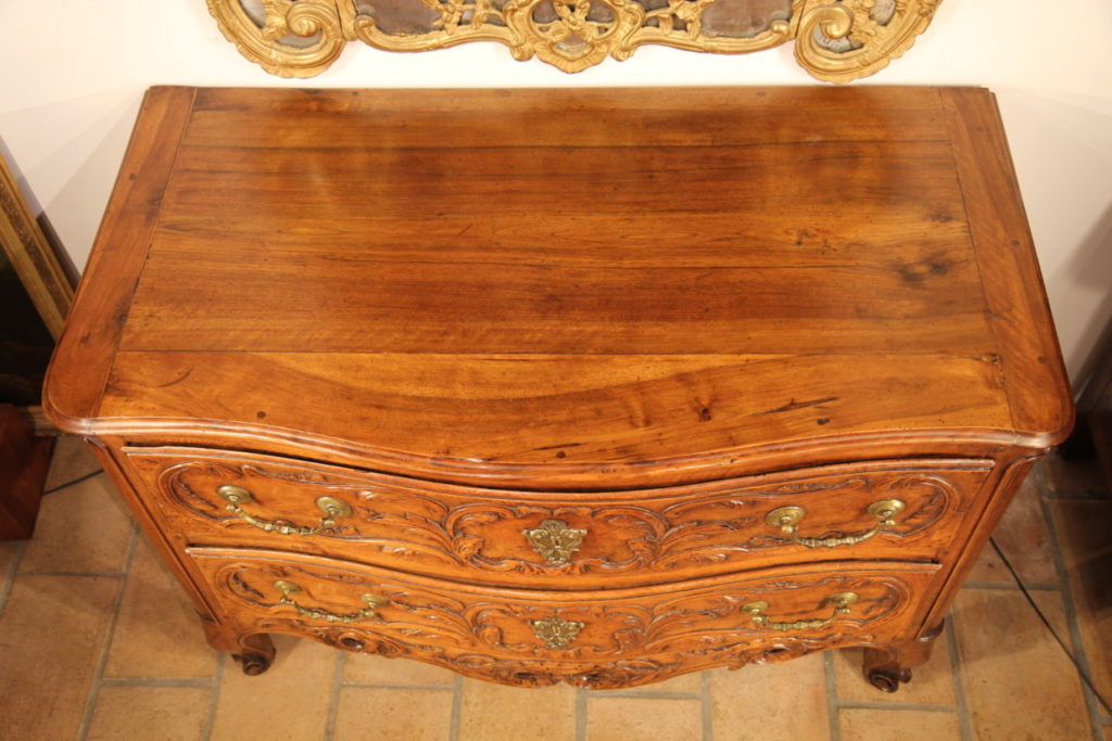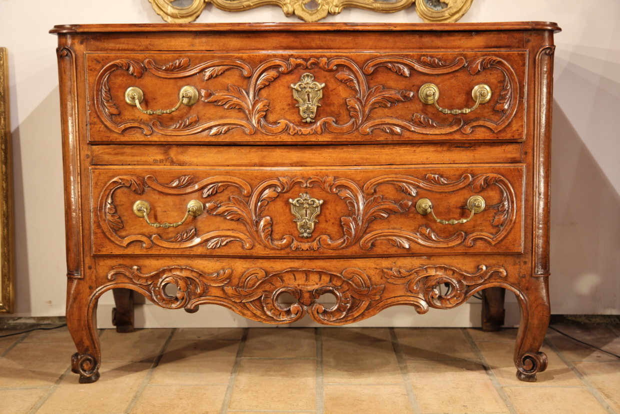 18th C Commode (chest of drawers) from Nîmes comprising 2 drawers. The curved front is adorned with a rich carved decoration of acanthus leaves and an openwork scallop on the low crossbar. It ends on 4 scroll feet. The front uprigths are rounded with protruding mouldings. The bronze handles and keyholes are original.