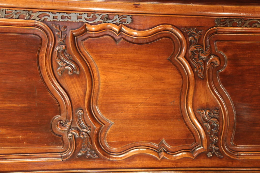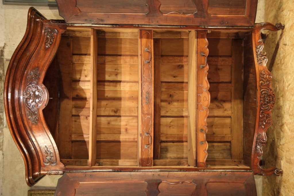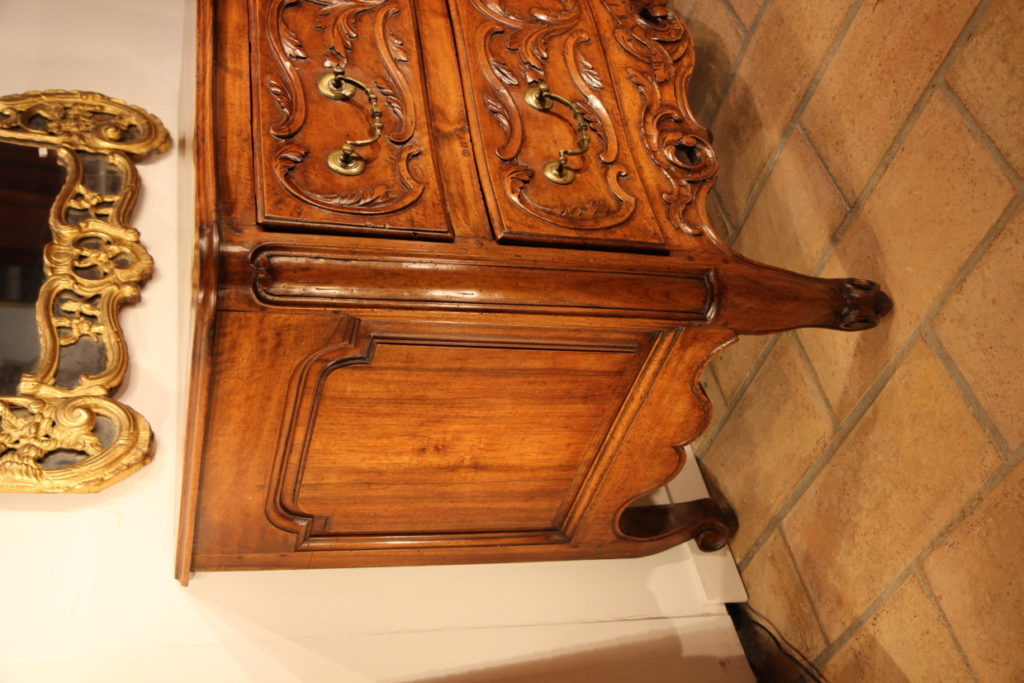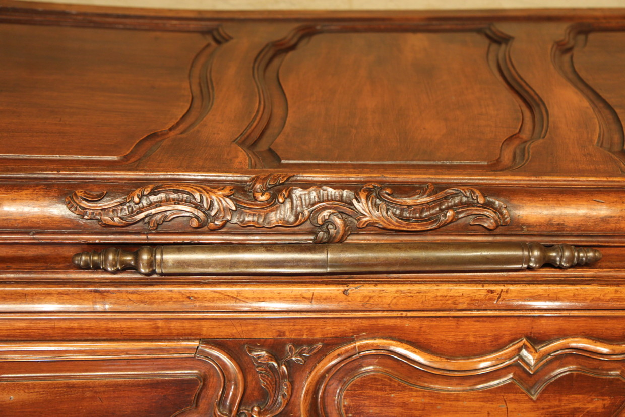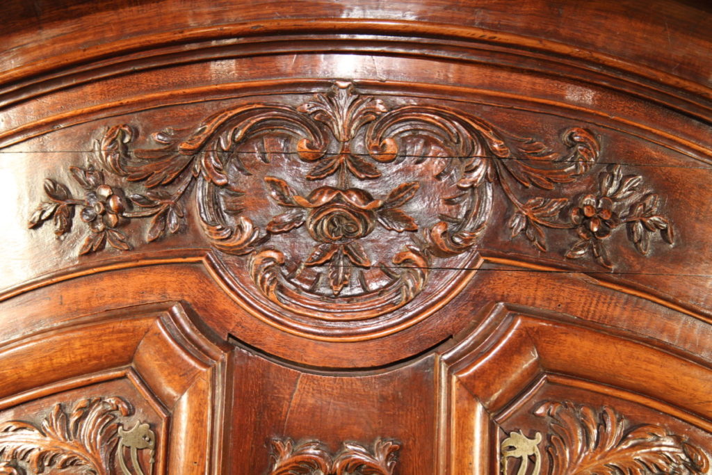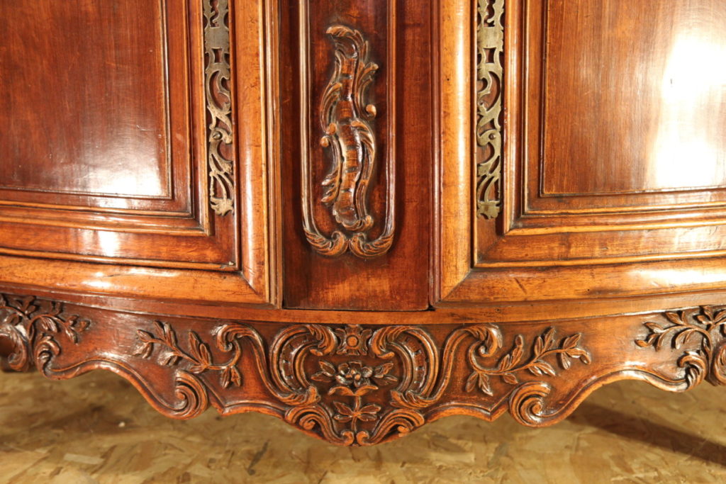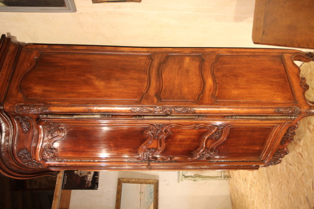 Sizeable 18th C Armoire from Arles (Provence). Rare prestigious piece of furniture with strongly curved front which demontrates all the know-how of the Master who made it. The doors, monted on 3 panels, are strongly moulded in many curves and counter-curves. They are decorated with fine sculptures in the Rocaille style, rich decoration also found on the cross bars and uprigths. The “chapeau de gendarme” cornice follows curves in all 3 dimensions. Beautiful ironwork with large hinges and clover lock.