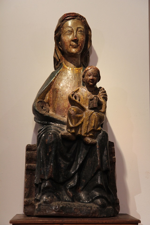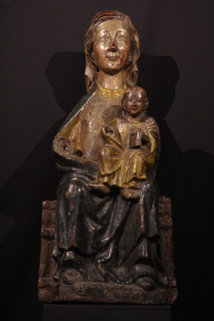 Sedes Sapientiae. Virgin and Child Enthroned. Sitting on a throne-bench, she carries her son on her left lap. Her serene face, with regular features, cracks a smile. The Child is dressed as a man and holds the Book of Sacred Scripture. His mother’s hand on his shoulder, he has a distant look : he is God’s Son.