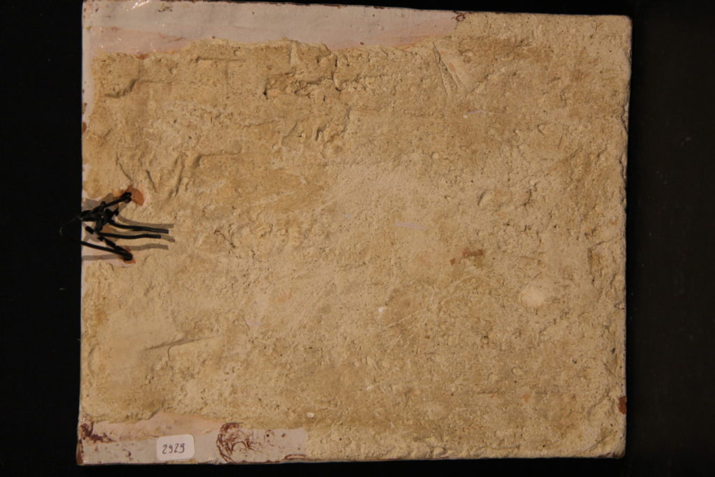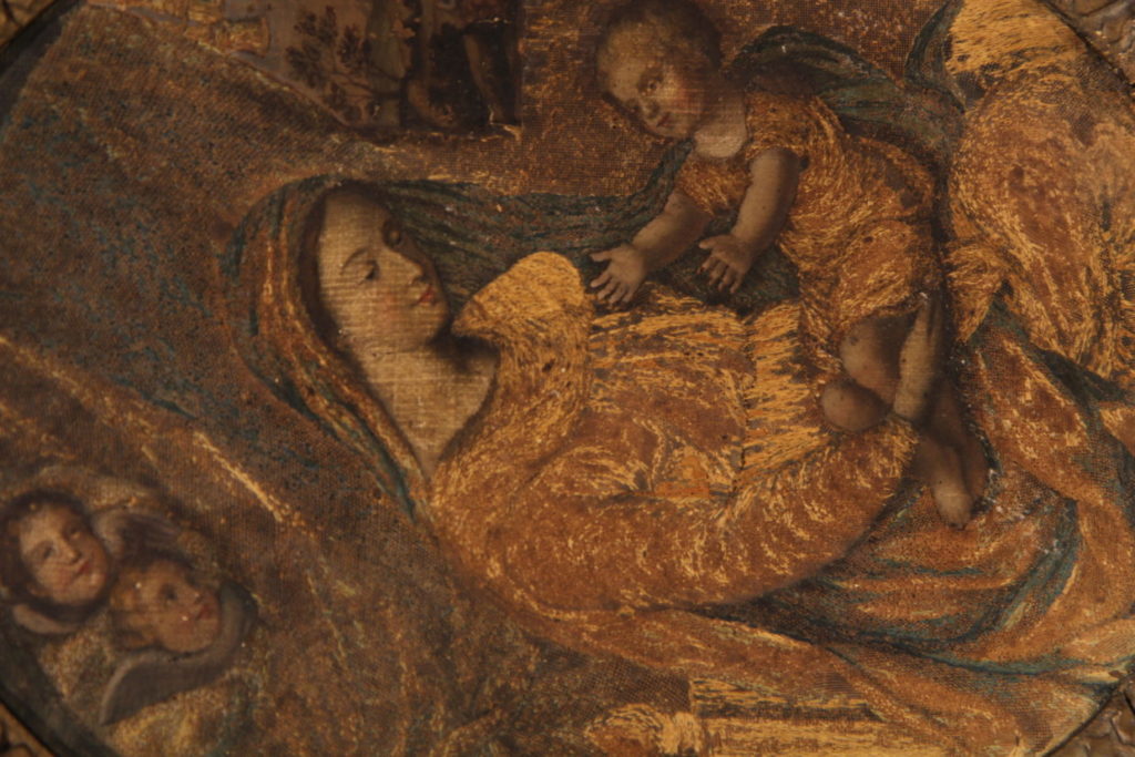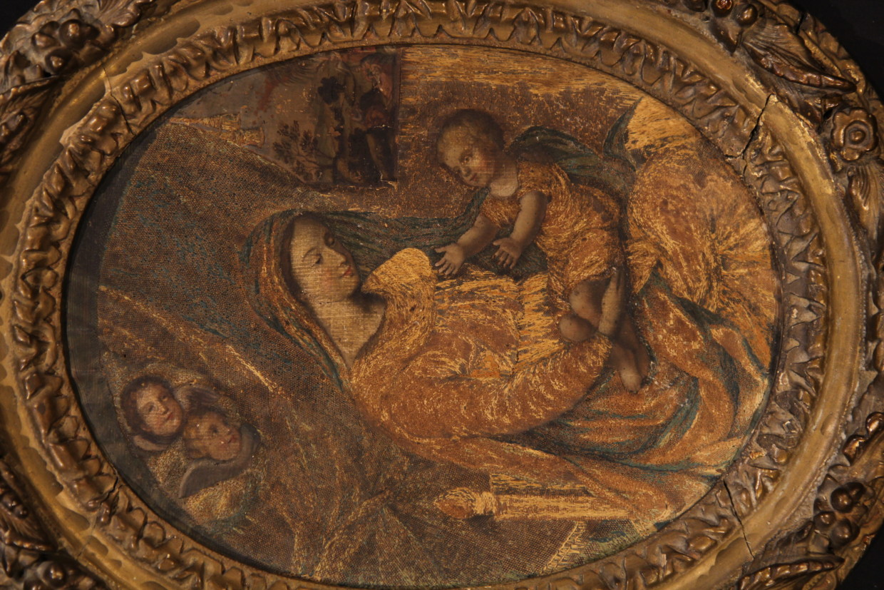 Ecole française du XVIII°. Vierge assise à l’Enfant. Broderie collée sur papier gouaché, lui-même collé sur toile marouflée sur panneau de bois. Probablement un travail de carmélite.