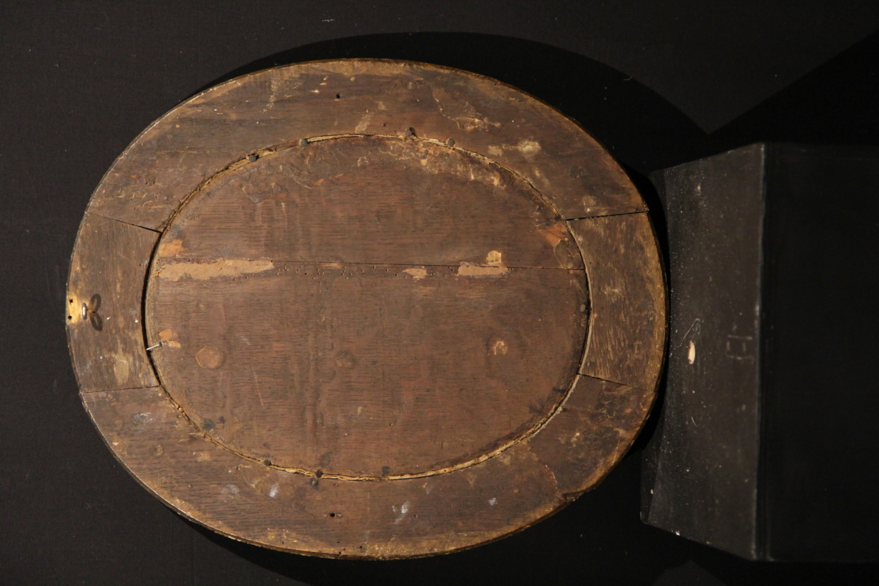 Ecole française du XVIII°. Vierge assise à l’Enfant. Cadre ovale en bois doré, d’origine.