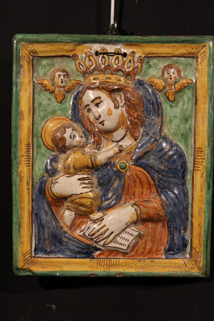 L’Enfant est assis sur le genou gauche. Il tient le Livre des Ecritures et lève le doigt au ciel. La Vierge présente une pomme (symbole du péché originel) dans sa main droite, la main gauche posée sur l’épaule de son fils.