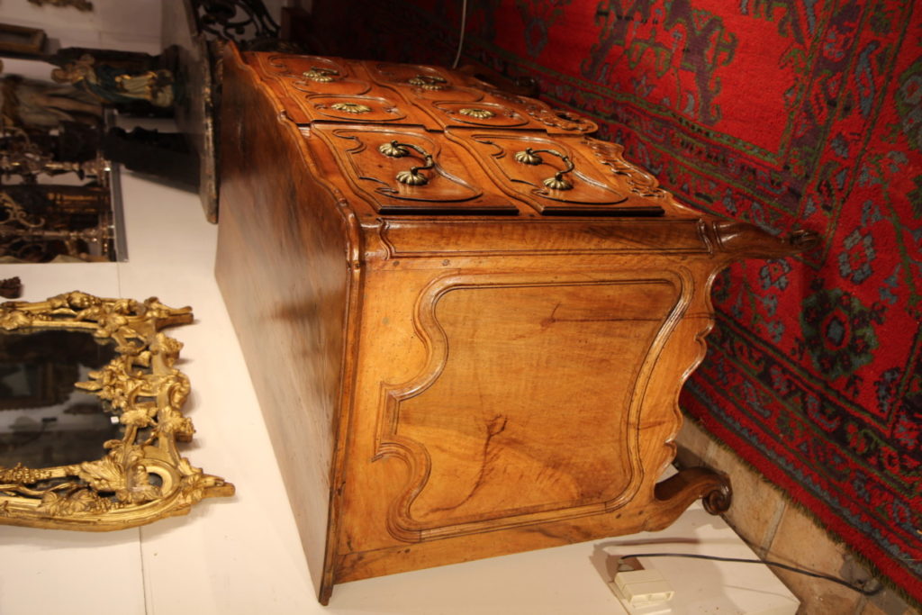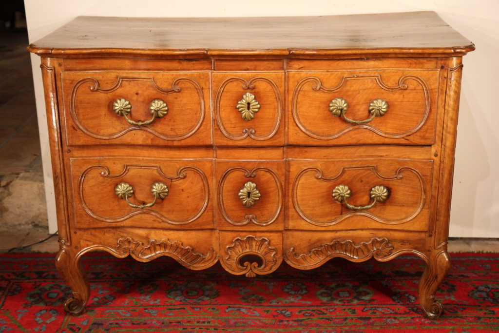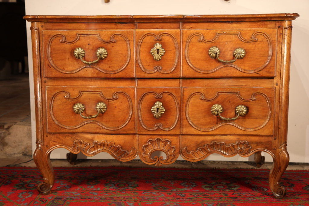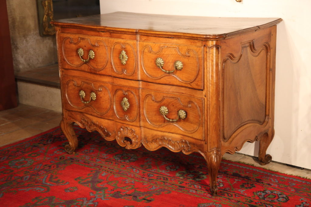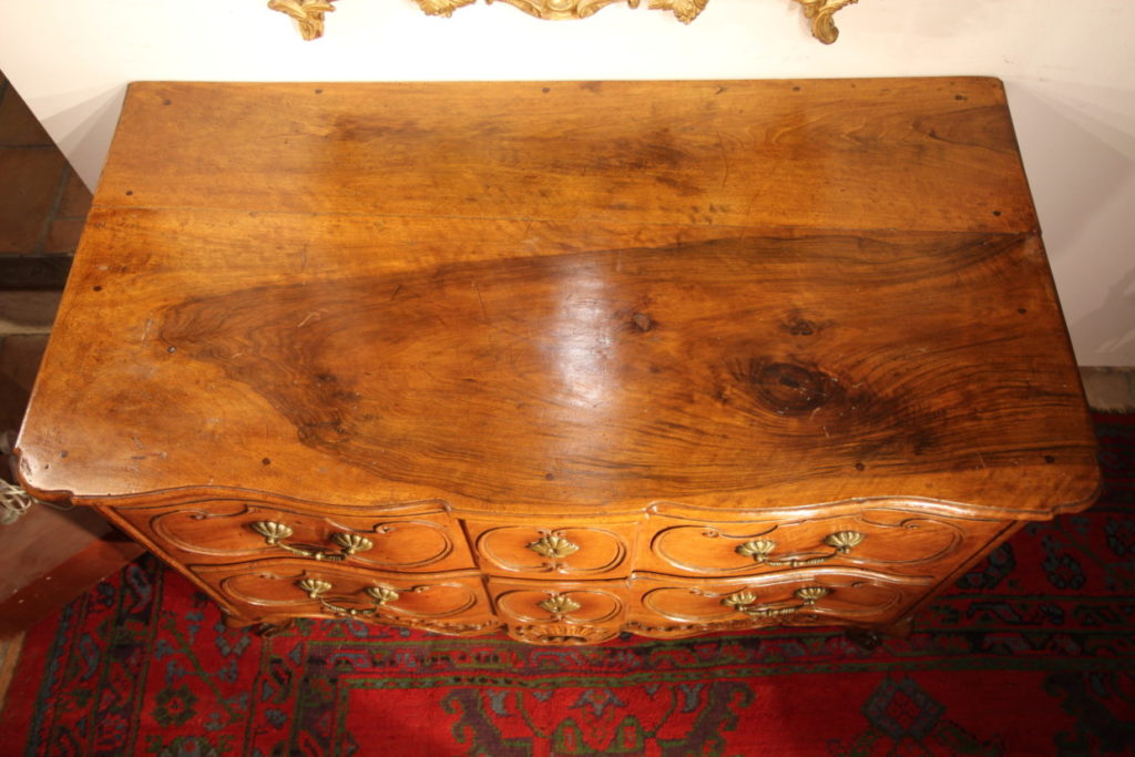 Commode varoise sauteuse. Bois de noyer blond. Epoque XVIII°.