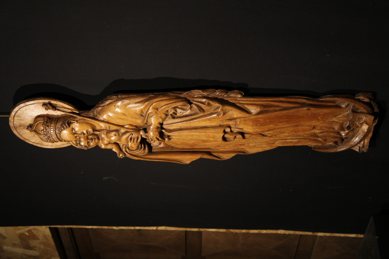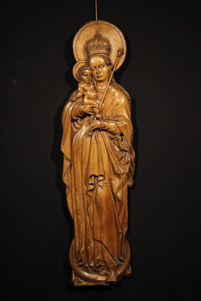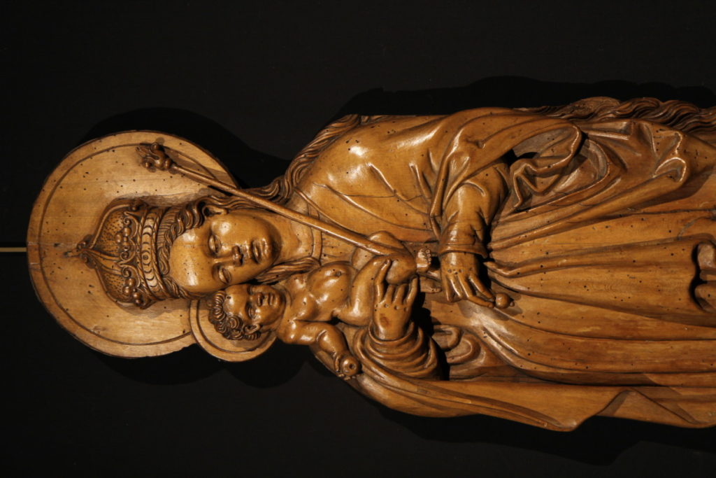 Statue en applique : La Vierge à l’Enfant. Sculpture en bois de tilleul exécutée avec tout le savoir faire des ateliers souabes : sophistication des plis, expressions des visages, soucis du détail (la couronne, la longue chevelure, le sceptre).