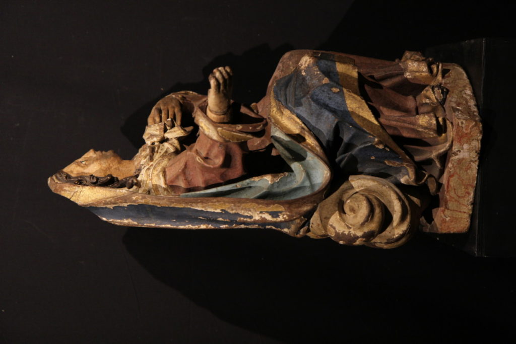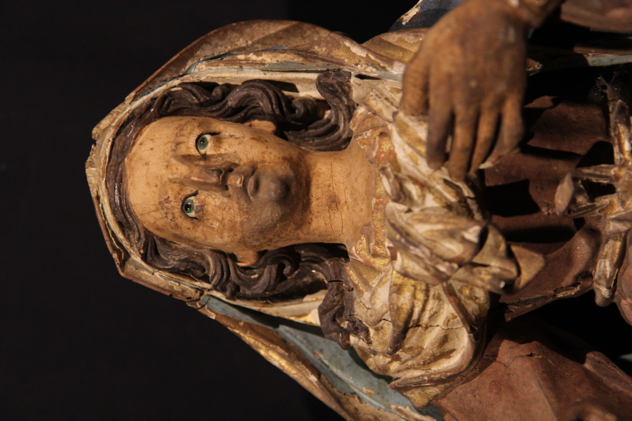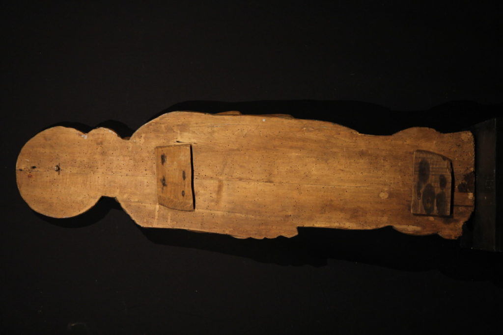 Yeux en verre. Dos évidé. Bois de noyer. Polychromie d’origine.