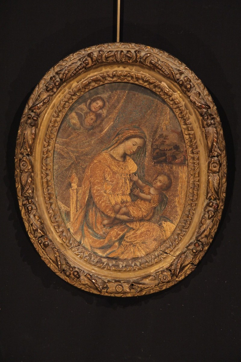 Ecole française du XVIII°. Vierge assise à l’Enfant. Cadre ovale en bois sculpté et doré, d’origine.