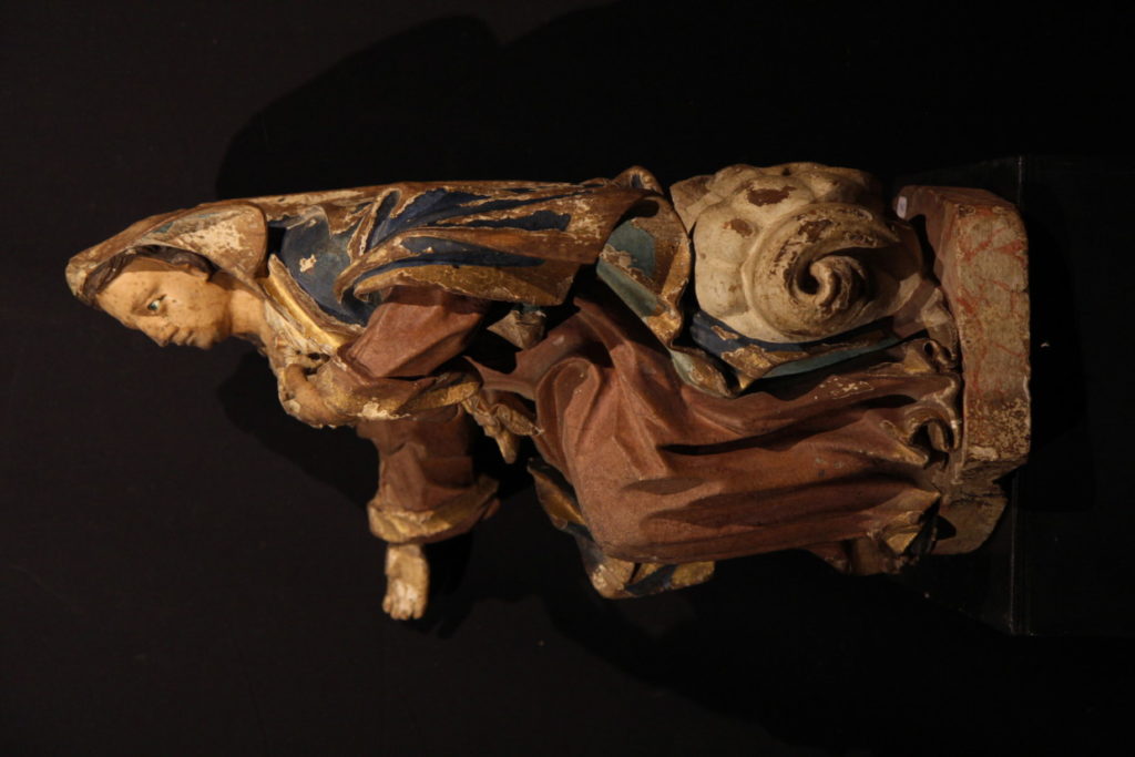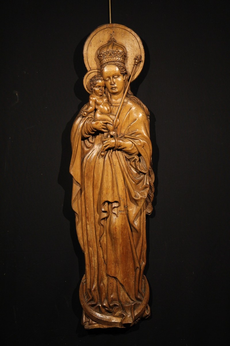 Statue en applique : La Vierge à l’Enfant. Sculpture en bois de tilleul exécutée avec tout le savoir faire des ateliers souabes : sophistication des plis, expressions des visages, soucis du détail (la couronne, la longue chevelure, le sceptre).