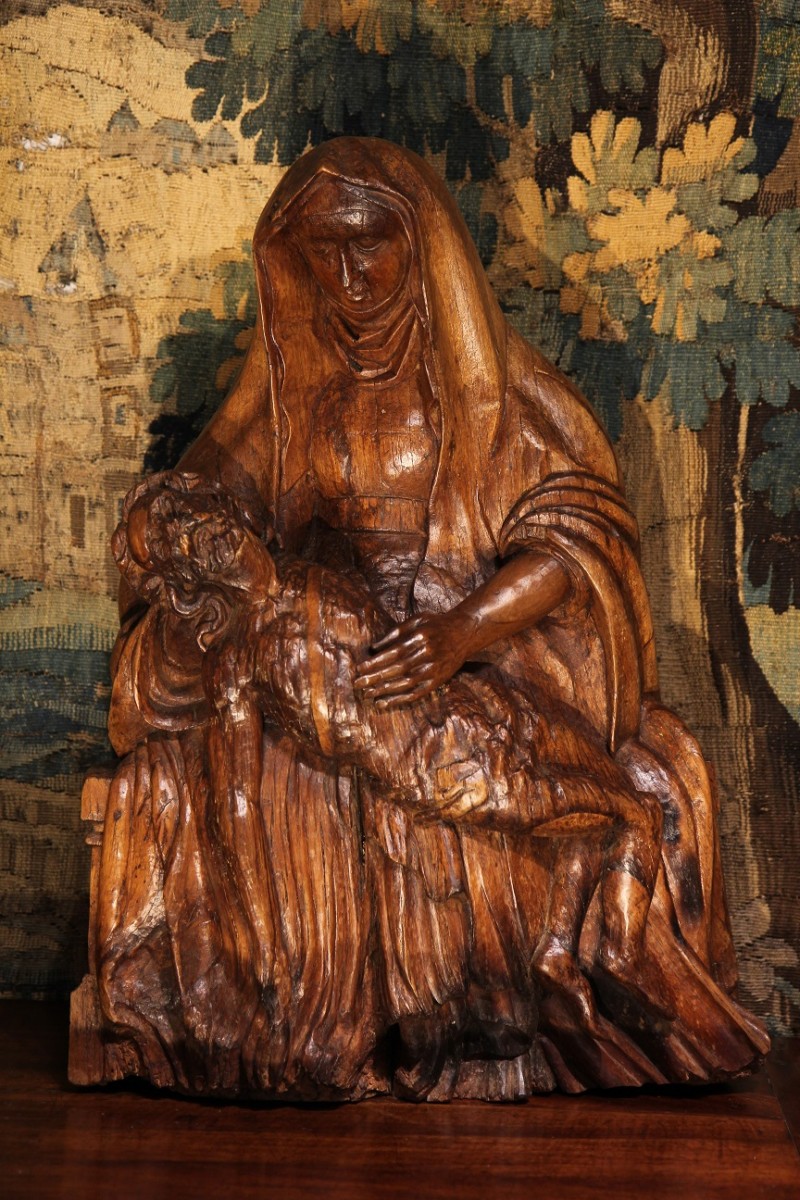 Pietà in carved oak wood. The Virgin seated, covered with a veil cloak and wearing the wimple, holds on her knees the body of her son.