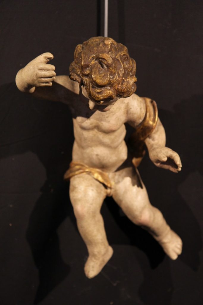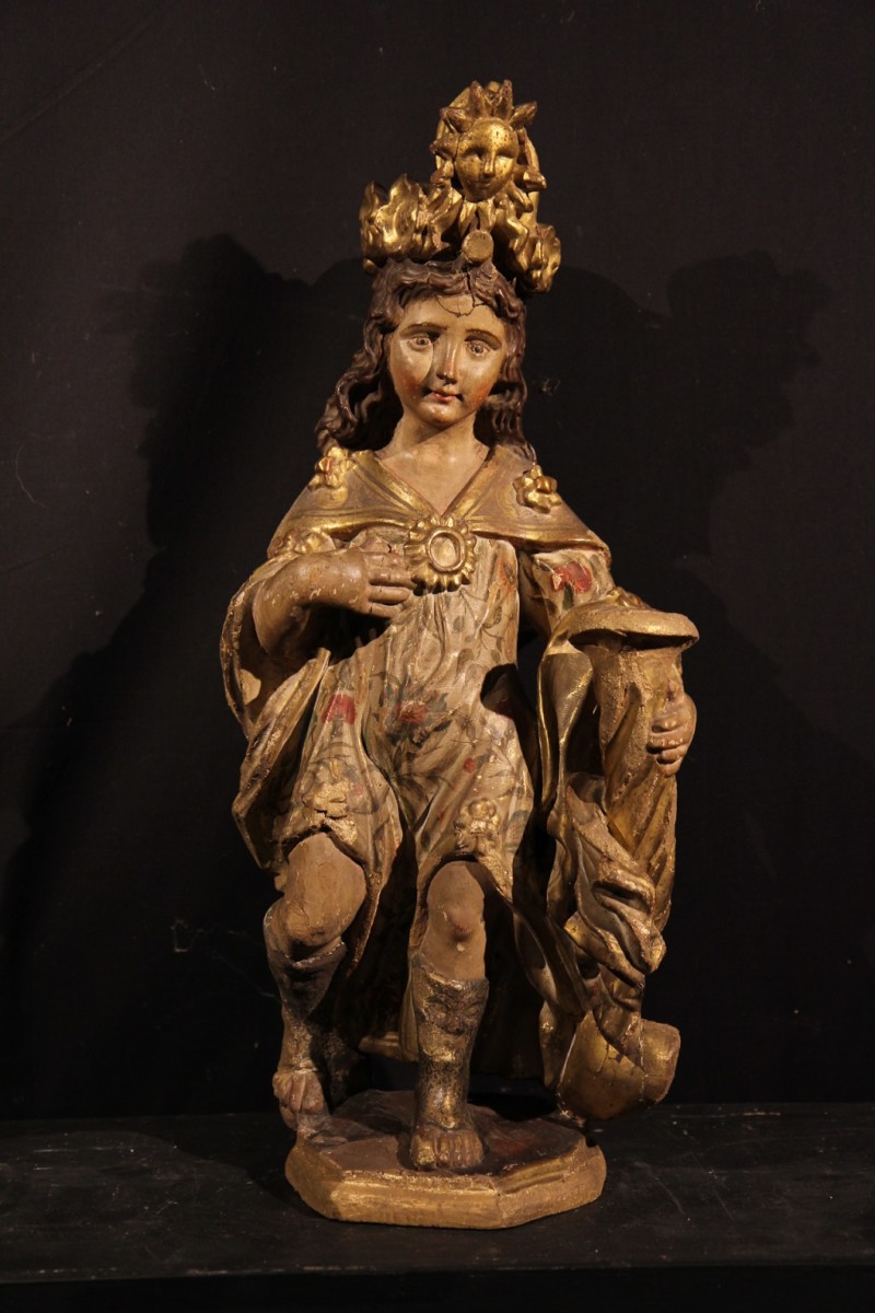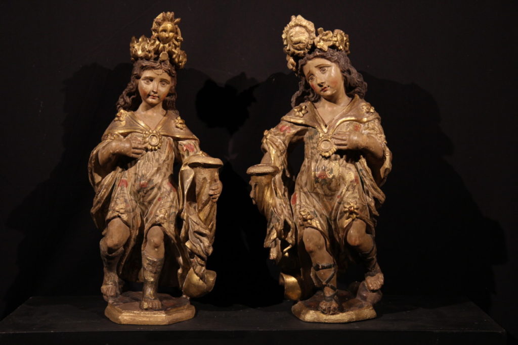Carved, gilded and polychrome wood candle holders pair representing two young persons dressed in tunics with moving pleats in the Baroque spirit, and with long hair crowned with flowers with the emblems of a sun and a feline (Inca divinities). Beautiful expression of faces with a touch of melancoly. 17th C Spanish Andean work.