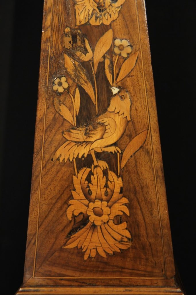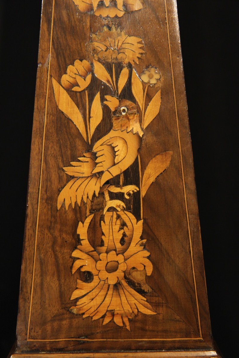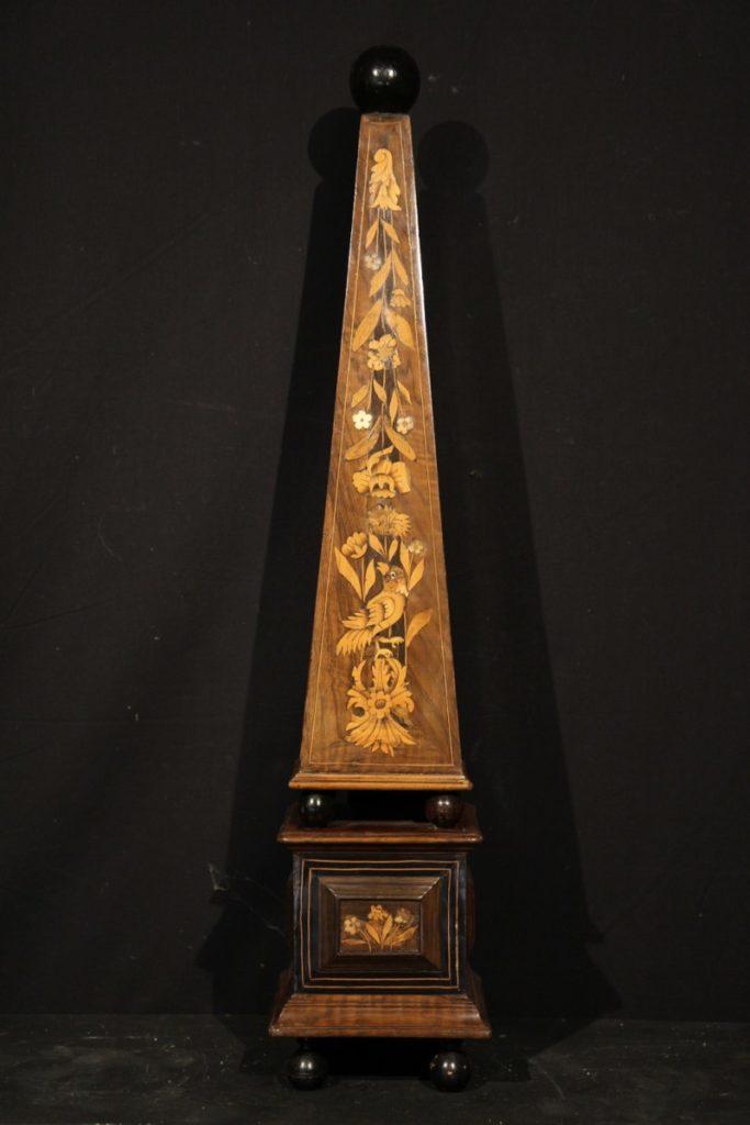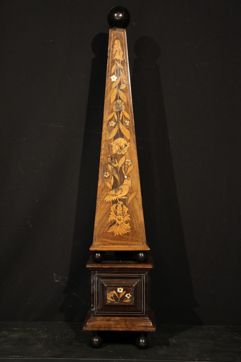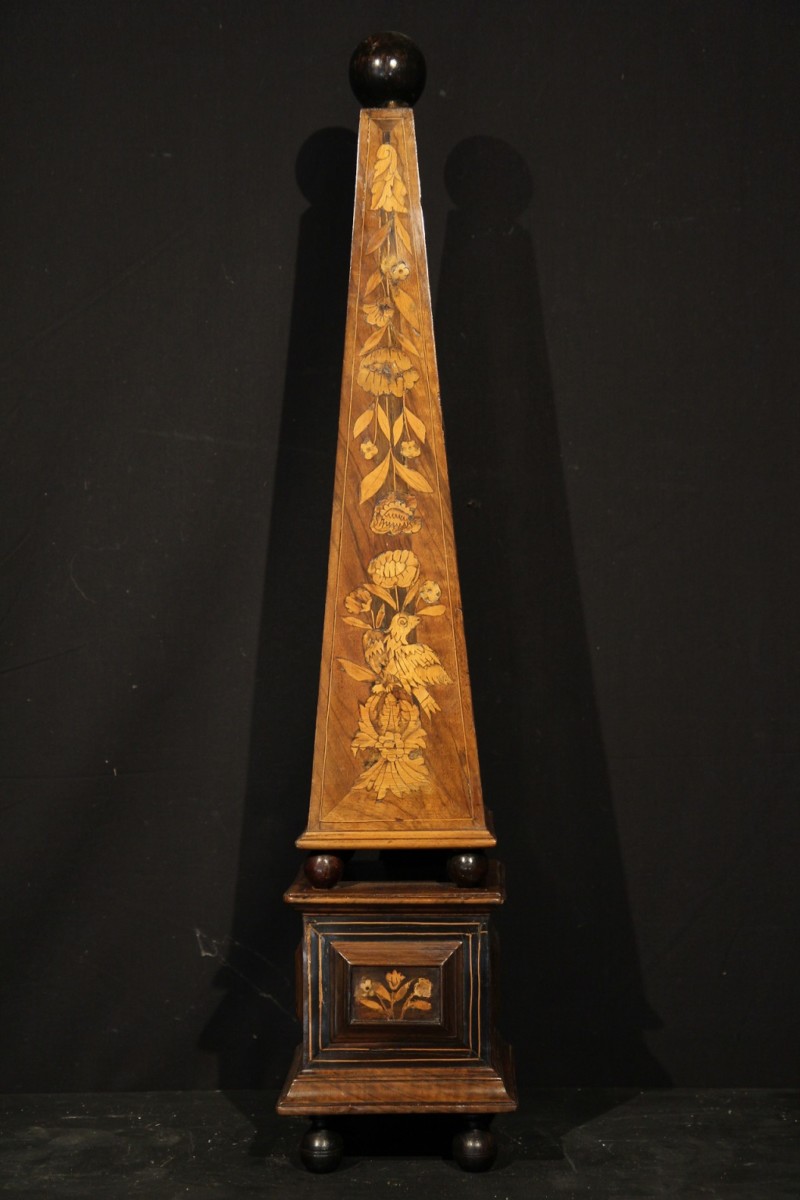 18th C Obelisk in walnut and rosewood with marquestery on all sides in clear wood with decoration of birds, flowers and foliage with engravings made of ivory. Dutch work.
