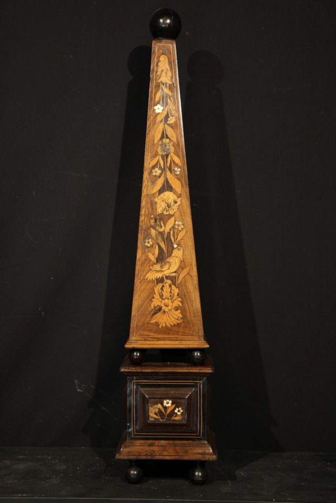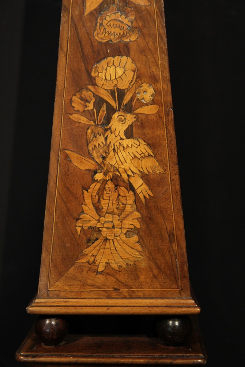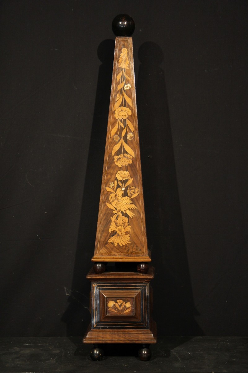 18th C Obelisk in walnut and rosewood with marquestery on all sides. Dutch work.