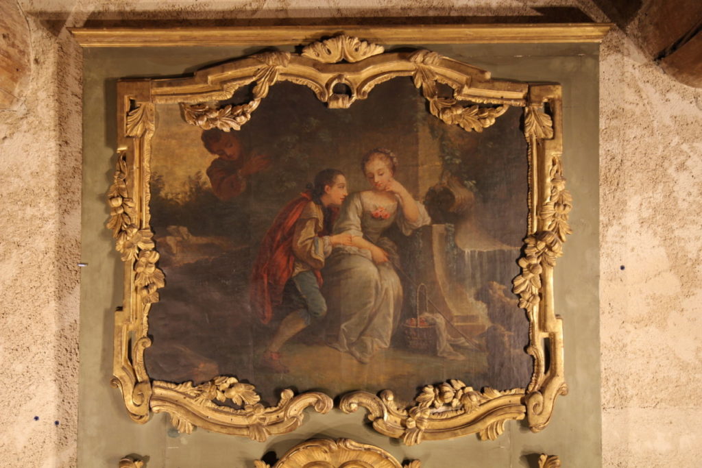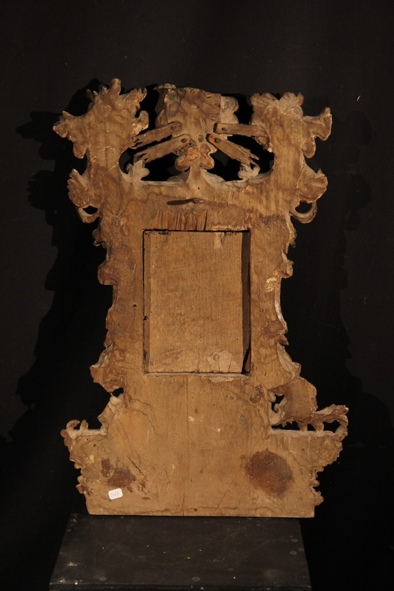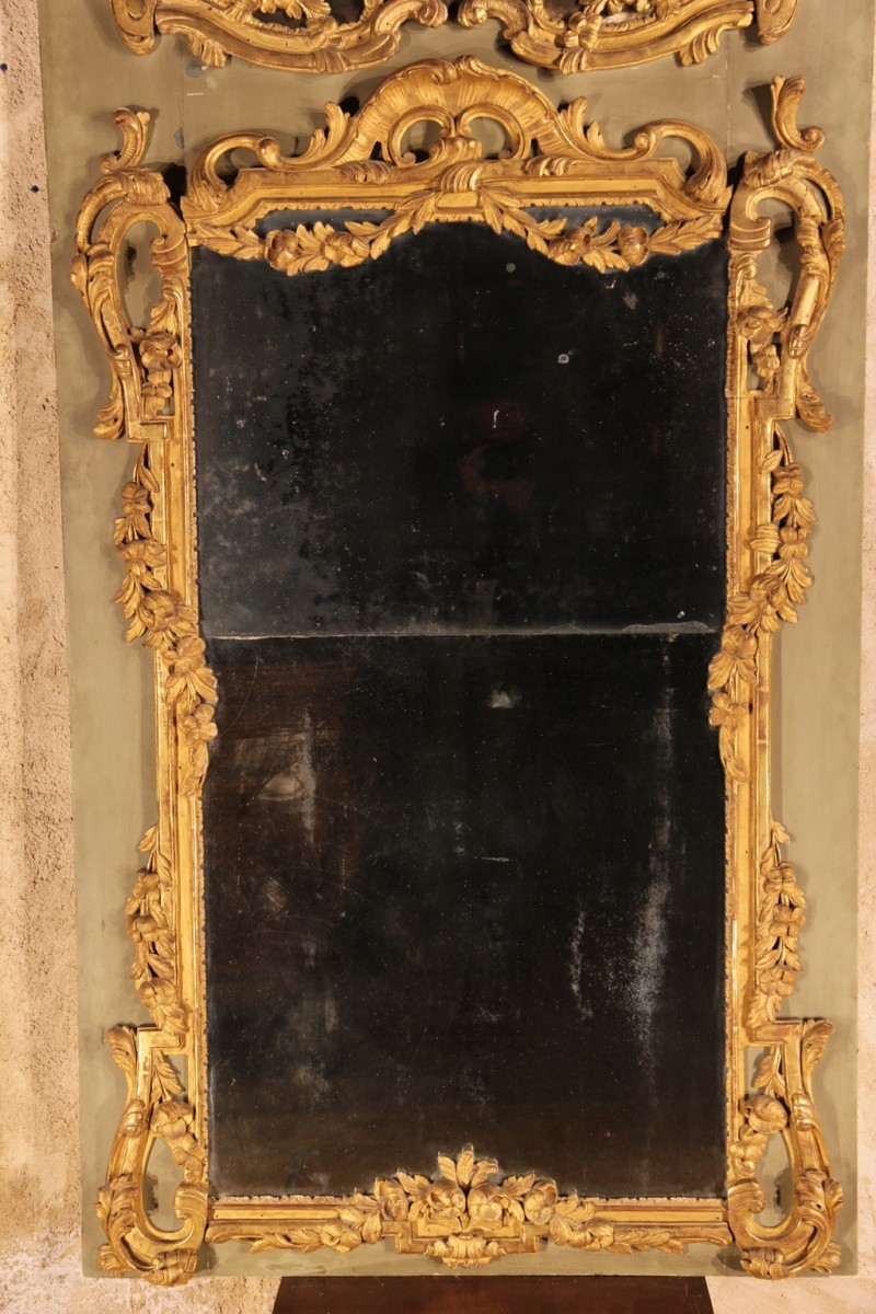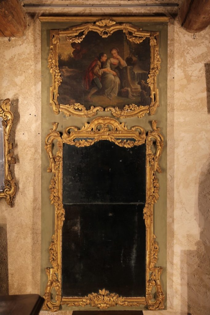 18th C Regency pier glass. The mirror in two parts with mercury back, is surmounted by an oil on canvas with the theme of a gallant scene. The whole is richly framed by a carved and gilt wooden decoration with Rocaille motifs, embellished with many garlands.