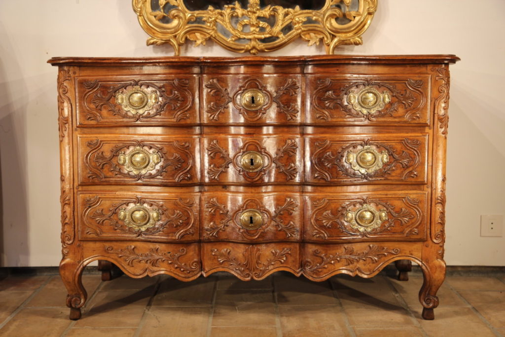 Late 18th C Languedocian Commode (chest of drawers) said in “arbalète” (crossbow). In walnut wood. Sold.