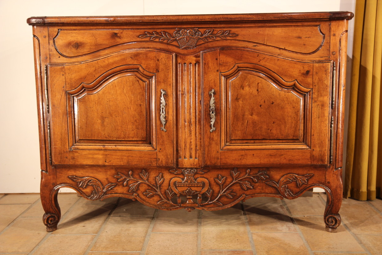 Late 18th C Louis XV Credence sideboard from Provence, comprising 2 doors arched in “chapeau de gendarme”. The top crossbar is carved with a decoration of basket of flowers; the low crossbar with soup-tureen and olive tree branches. Round front uprights ending in scroll feet. The top is moulded in corbin beak. In walnut wood.
