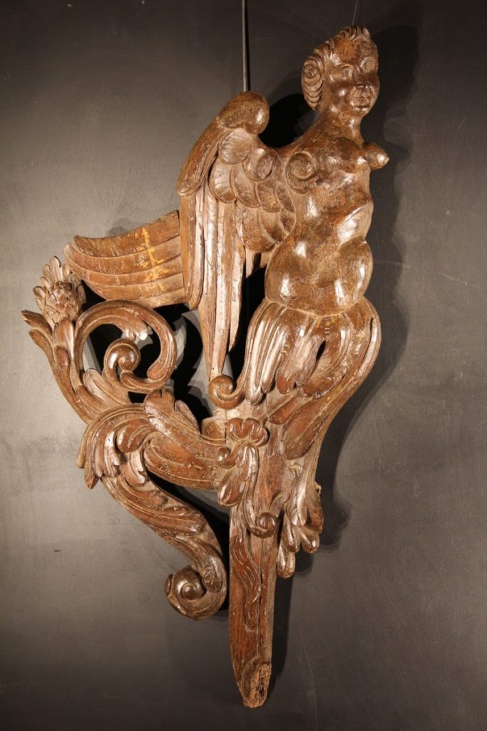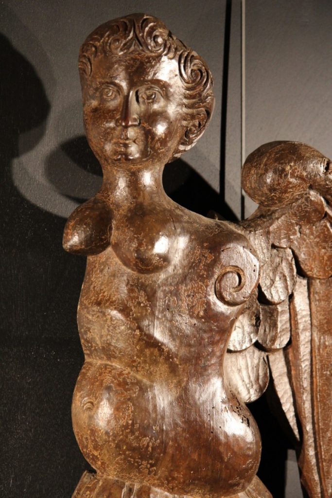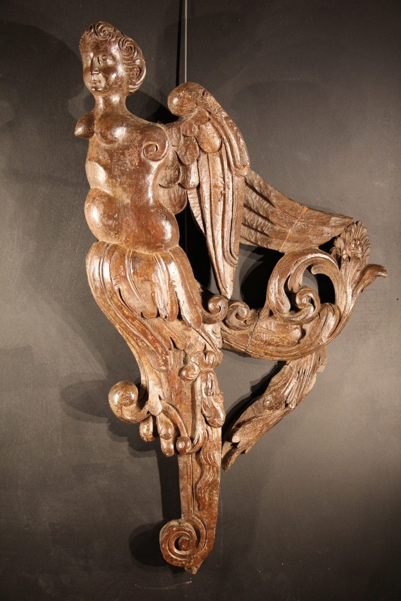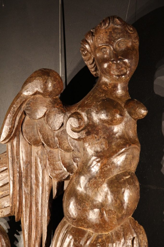 Pair of sculptures for naval vessels representing Sirens (combining women and birds according to Greek mythology) appearing from a leaf decor. These sculptures adorned, in the 17th and 18th centuries, the French warships. In walnut wood with tracks of polychromy.