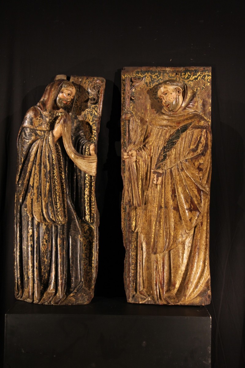 16th C Pair of Saints Abbots carved in 2 gilt and polychrome panels of walnut wood. Wearing the monastic habit and the tonsure, they hold the Abbots’ crosier, sign of their rank. Probably elements of a Castillan altarpiece (Spain).