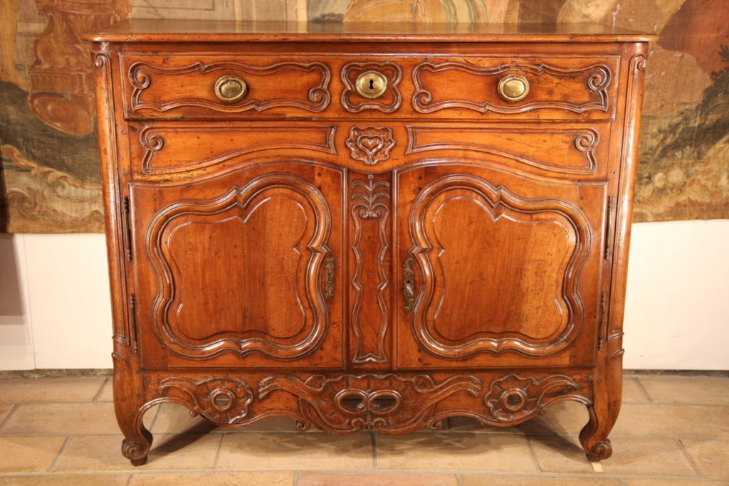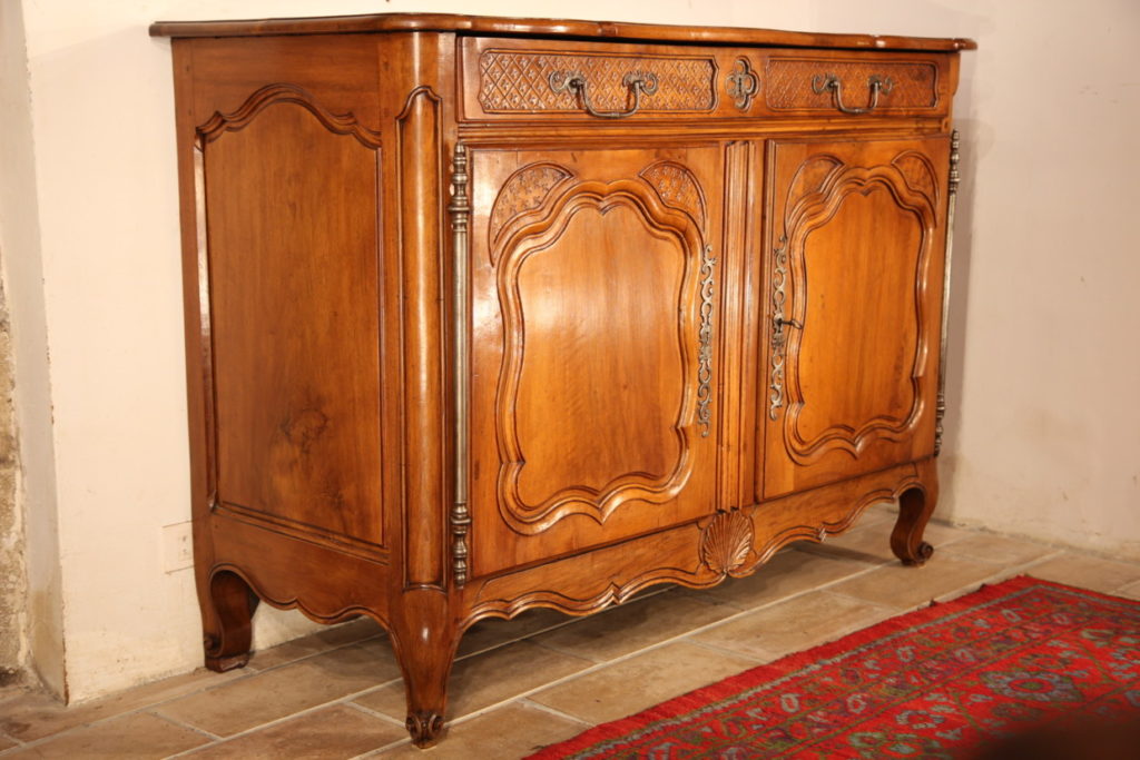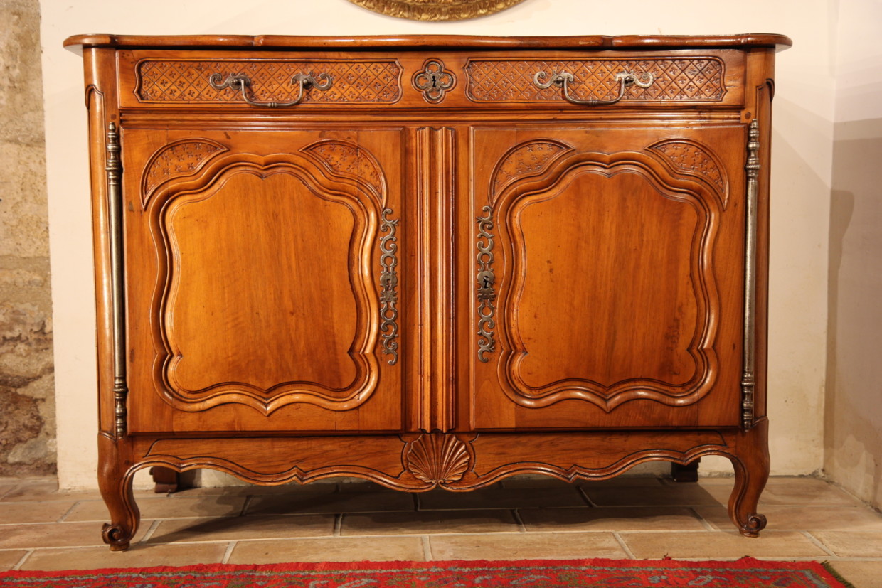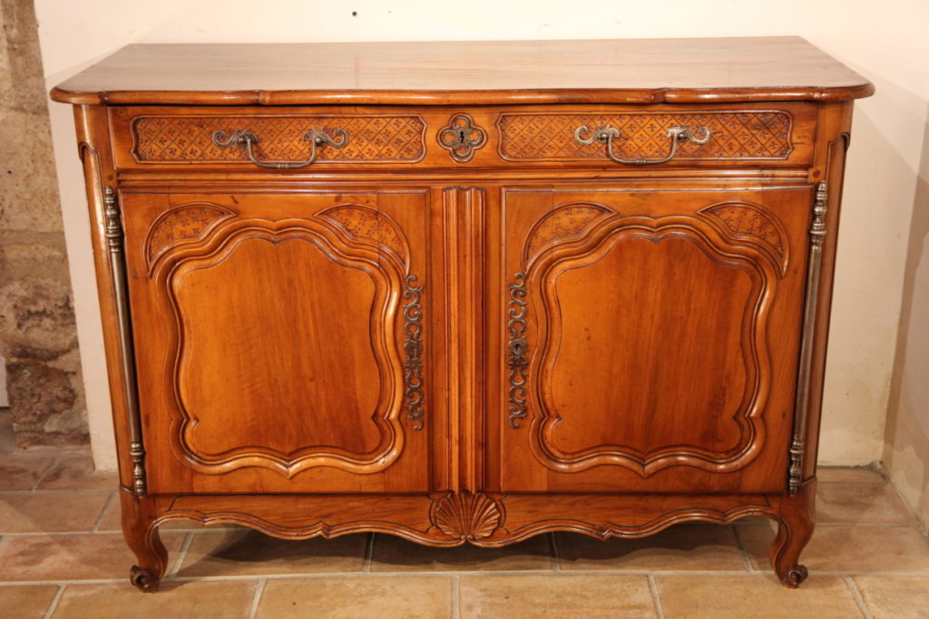 18th C Important buffet (sideboard) from Marseille comprising 2 doors with false door leaf, and a drawer. The front is decorated with fretworked panels with prominent mouldings, cartouches and a shell on the low crossbar. Based on 4 scroll feet. The top is crossbow shaped. Original ironworks. In walnut wood.