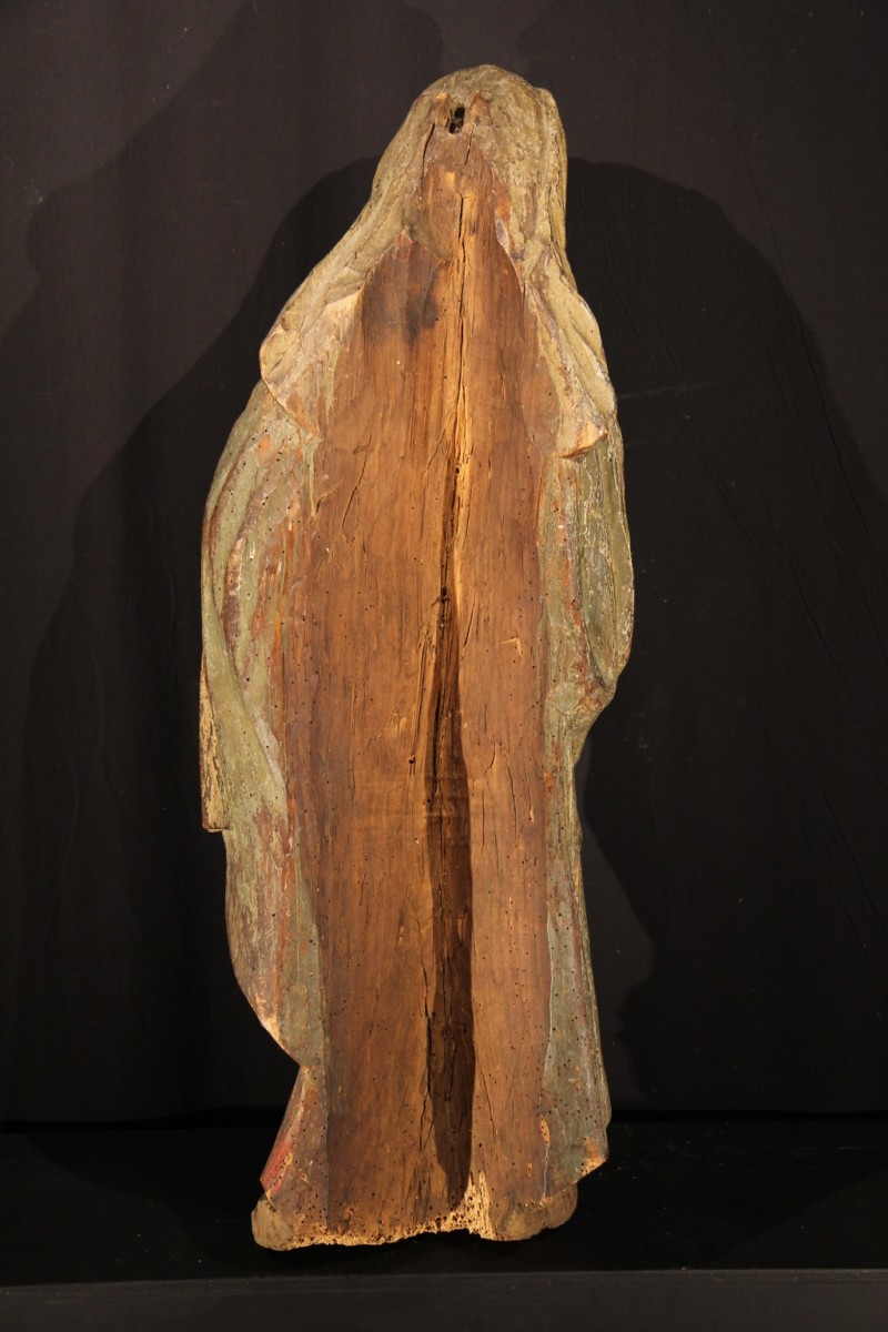 Late 15th C statue of a Holy Woman. Probably Mary Magdalene with her long hair. Standing slightly off-balance wrapped in an apron coat. Wearing a dress with lapel sleeves and rounded neckline. In oak wood with traces of polychromy. Burgundian-Flemish work.