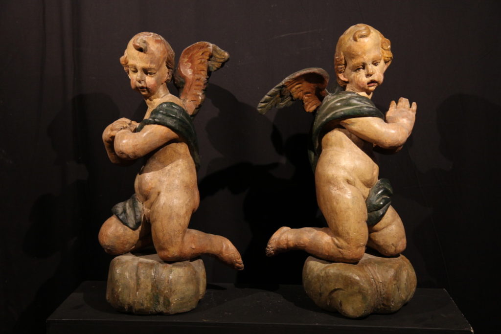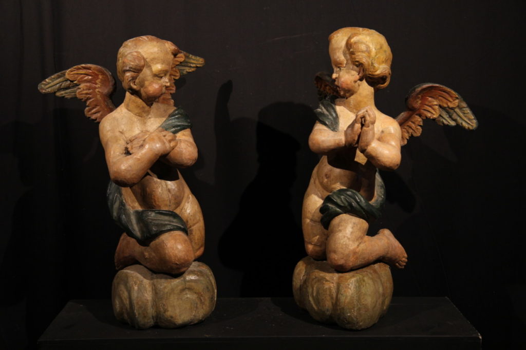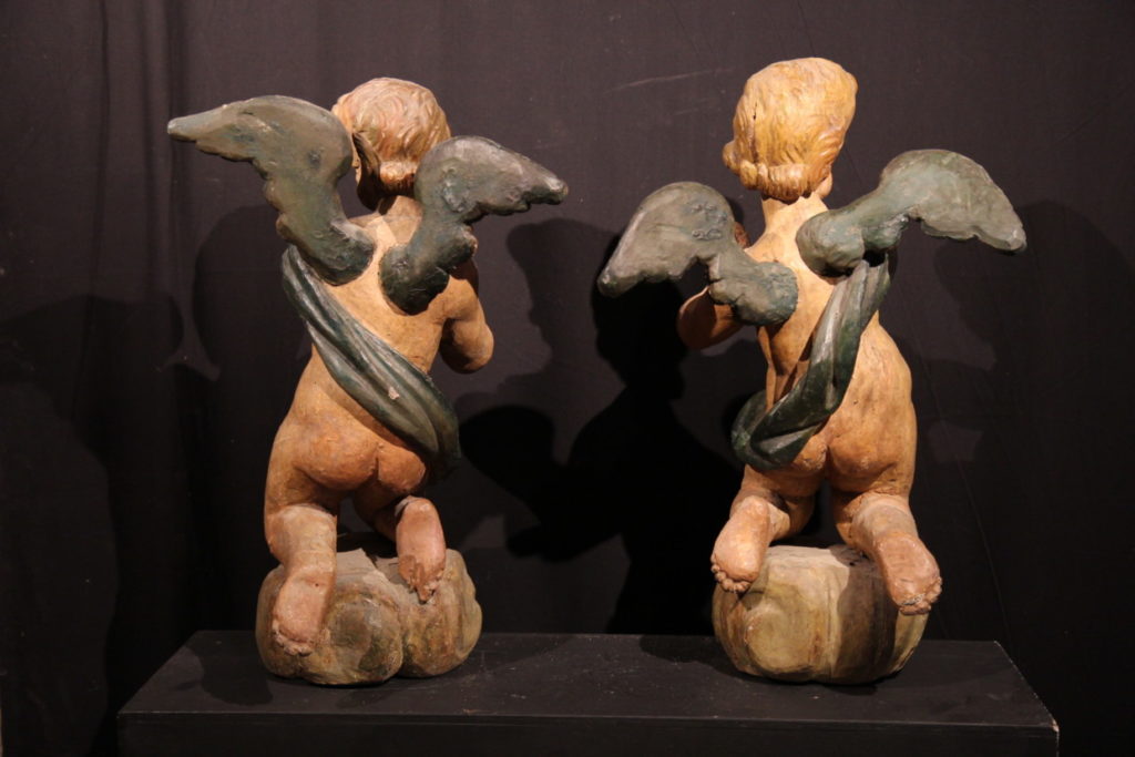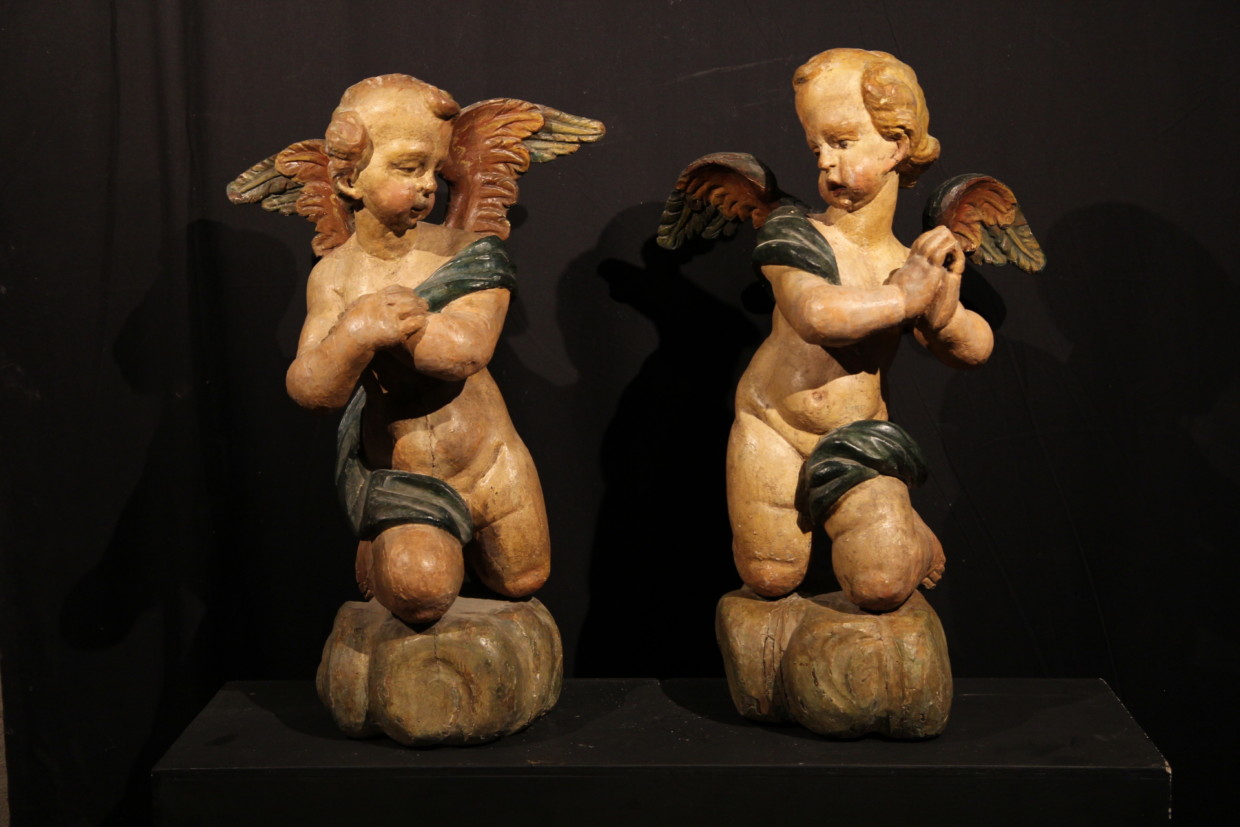 17th C Pair of angels in adoration in carved and polychrome wood. Alpine work, Tyrol or Savoy.
