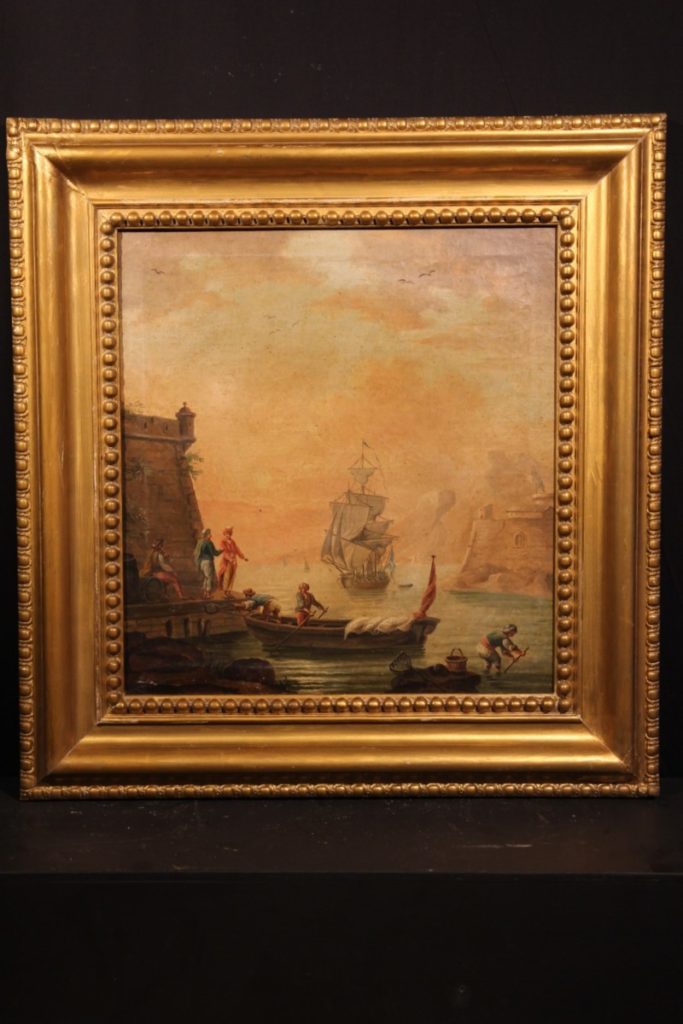Oil on canvas. Late 18th C French School. Seascape Imaginary Port. Follower of Charles-François de Lacroix said Lacroix from Marseille (1720-1782). On its original canvas. Ancient posterior frame.