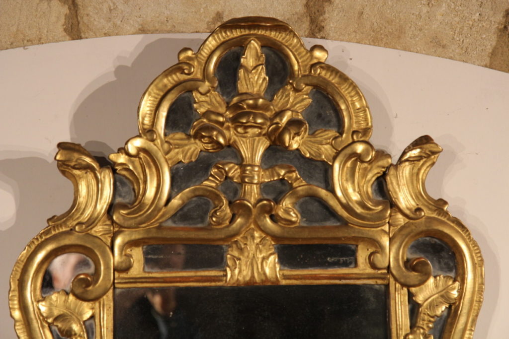 Period frame in carved and gilded wood, topped by a ribbon-wrapped pediment decorated with a rose, suggesting a wedding gift.