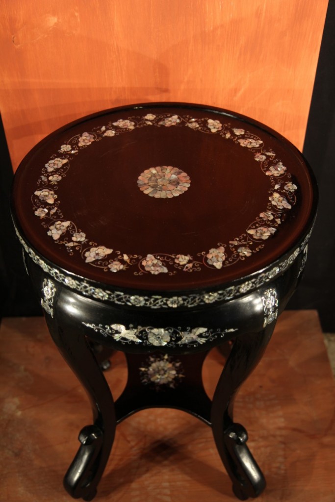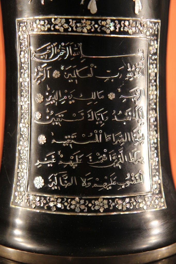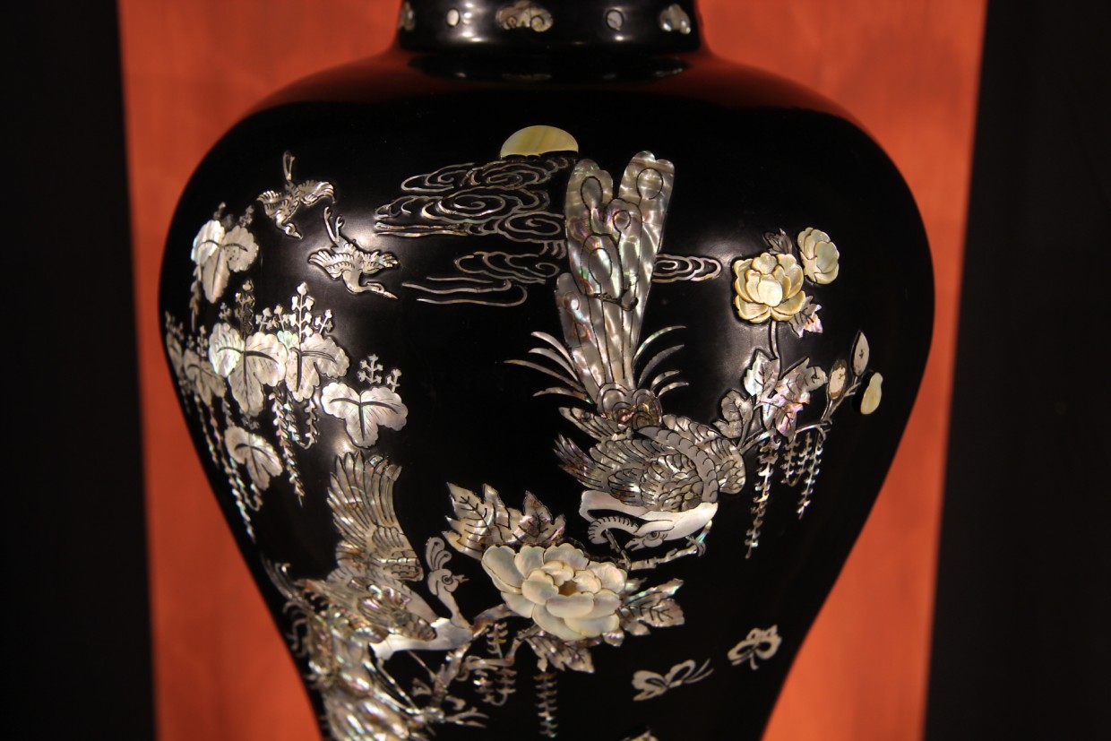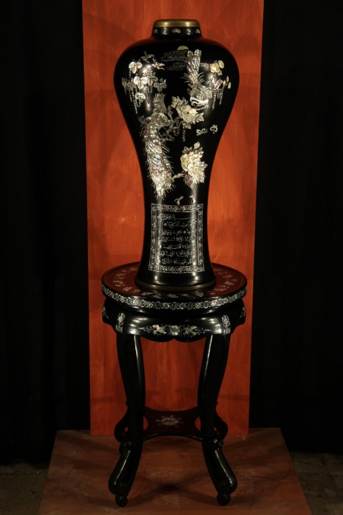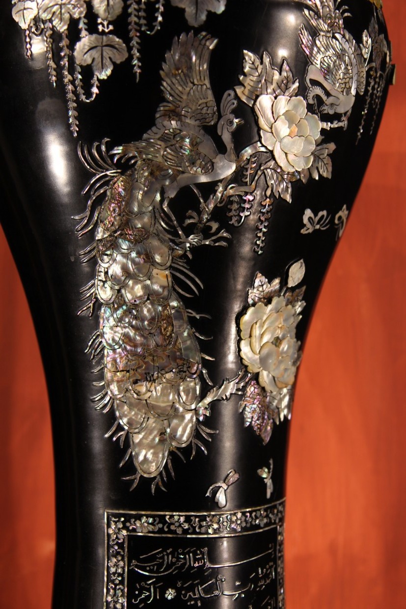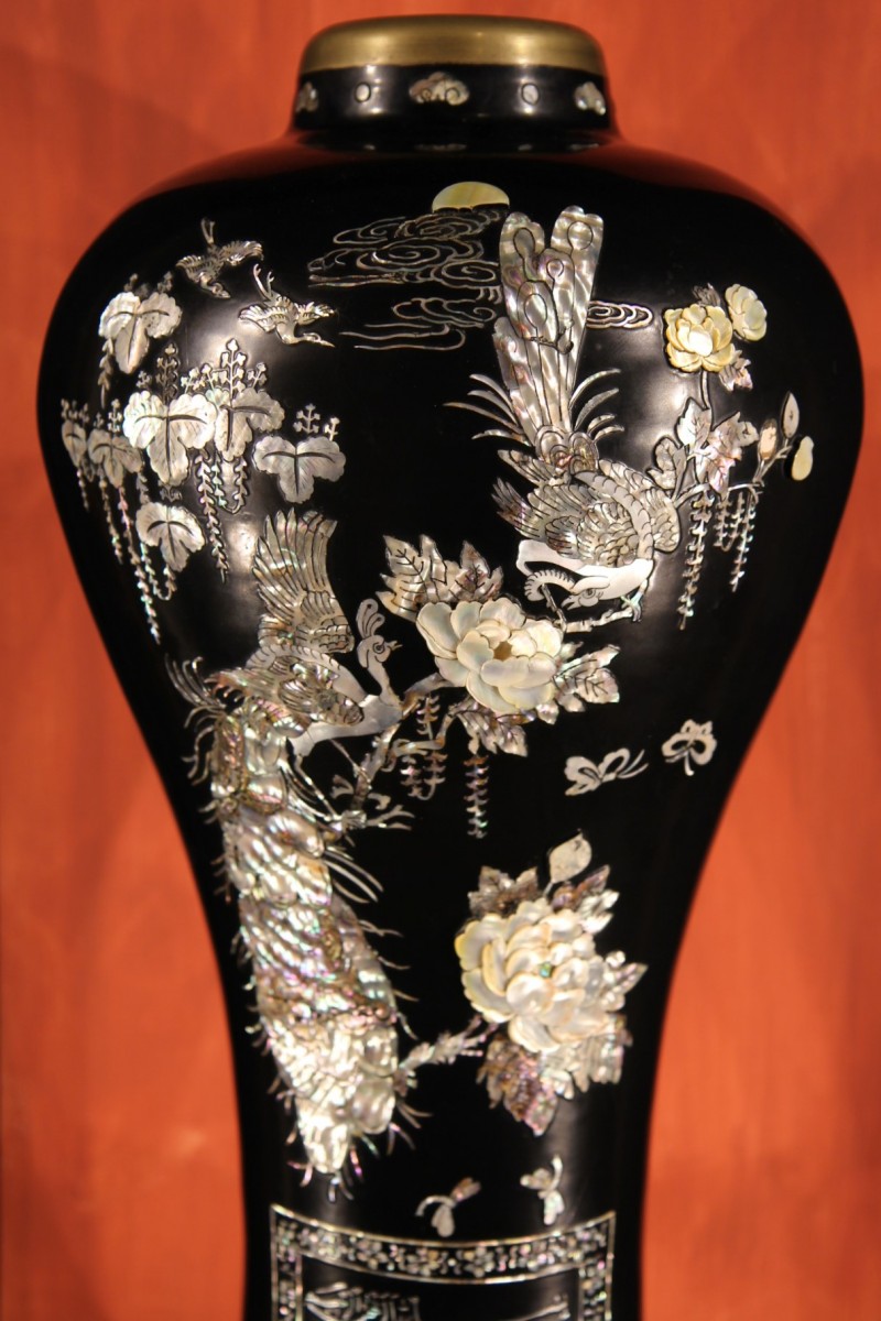 Important baluster vase and its pedestal in copper and lacqued wood with mother-of-pearl inlay. A similar vase would have been offered to the King of Marocco by the Korean Embassy in the 1950s.