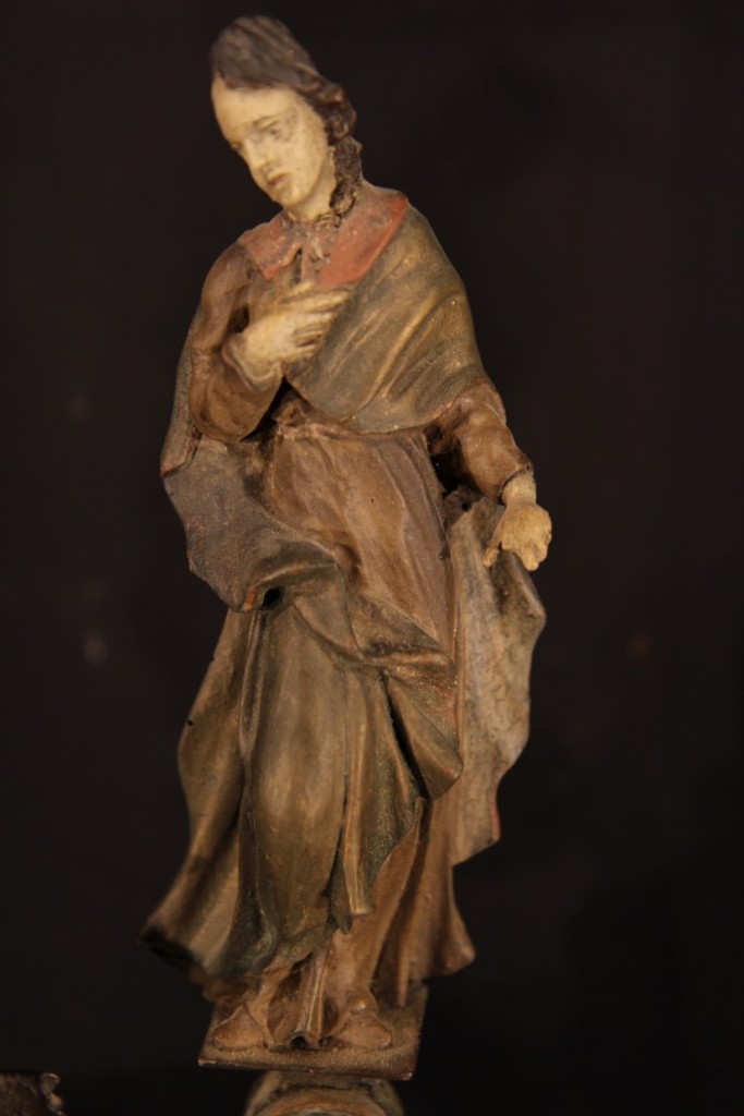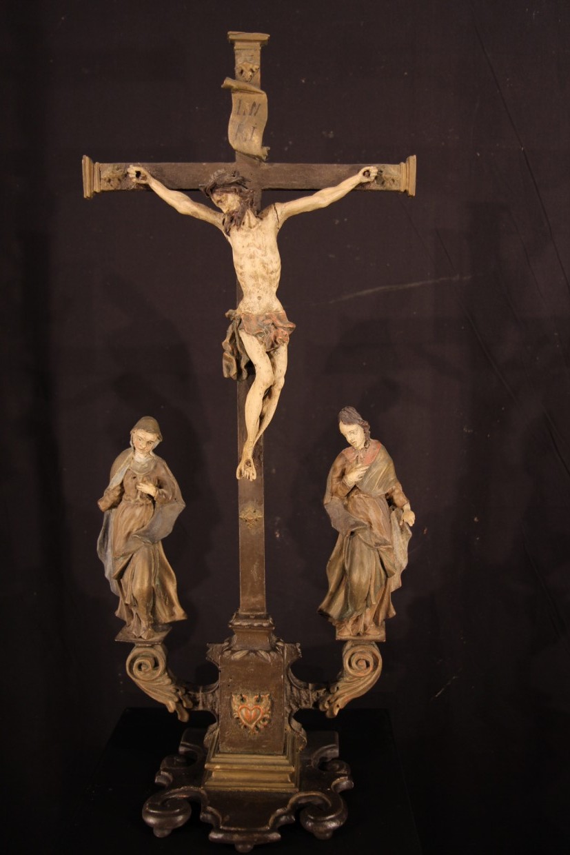 Late 17th C-early 18th C Baroque Calvary in carved and polychrome wood. From Eastern Europe. Sold.