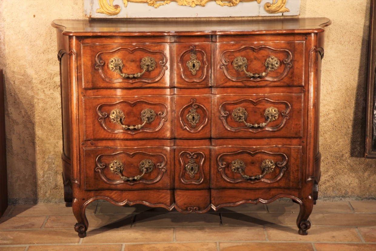Important 18th C Louis XV “commode” (chest of drawers) comprising 3 drawers. The front, in the shape of “arbalète” (crossbow) is richly carved with fretted cartouches. The sides are strongly curved. On 4 scrolled feet. In walnut wood. From Provence.