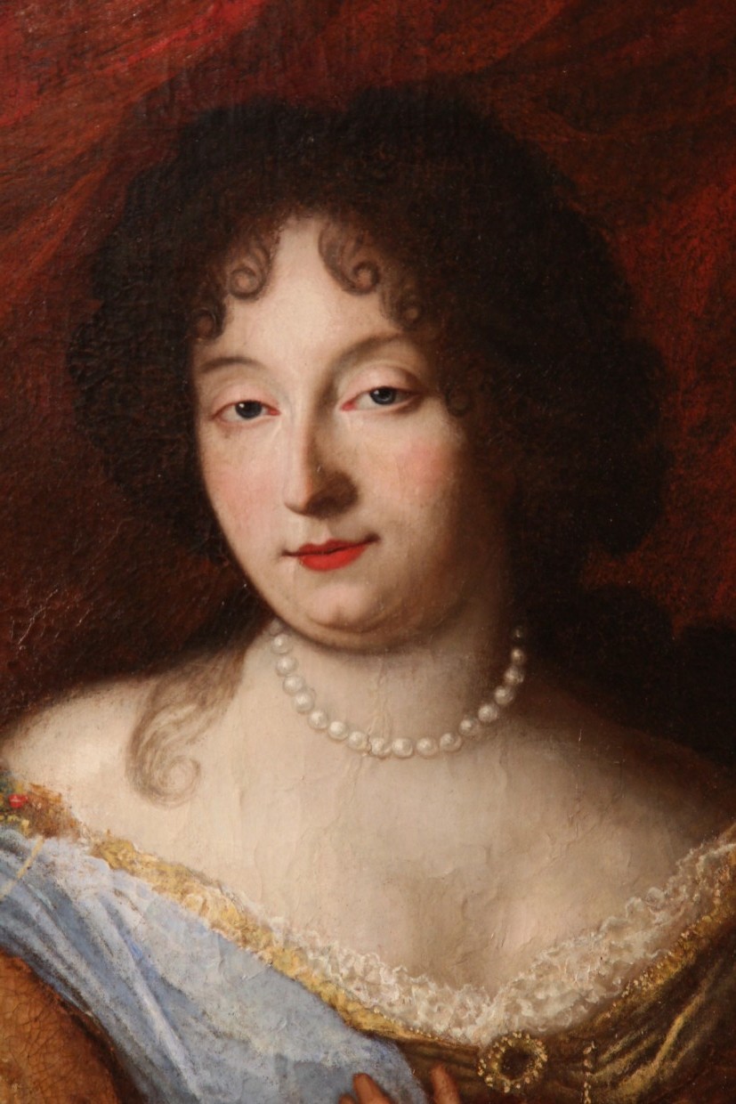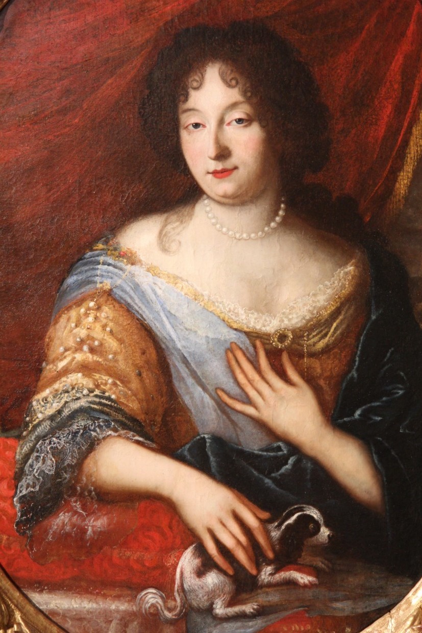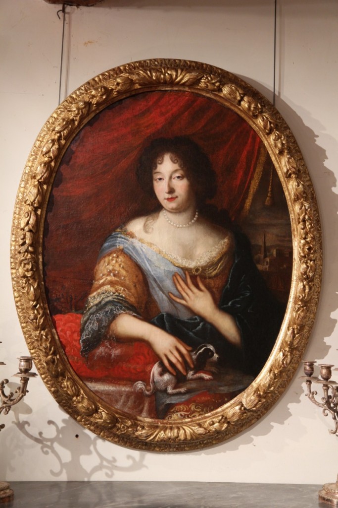 Oil on canvas. End of 17th C Provencal School, in the manner of Mignard. Half-length portrait of a lady petting her dog. Large period ovale frame in wood and stucco.