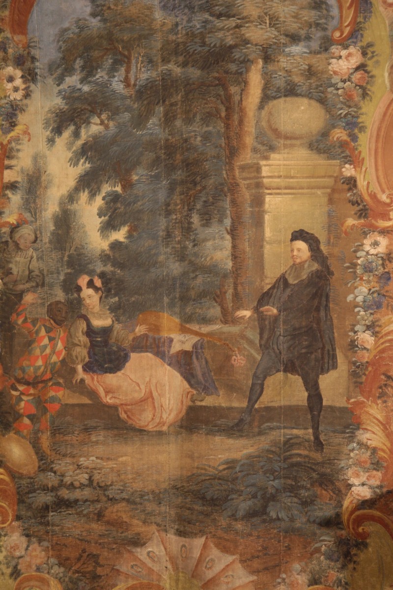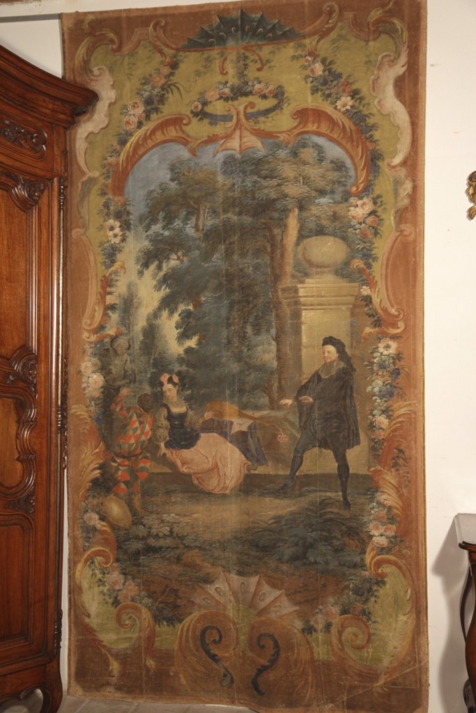 18thC painted canvas . Commedia dell’ arte. Posted on 30 December 2015 at 9 h 16 min by Anne Morlon / / 0 18thC painted canvas . Commedia dell’ arte. 18thC painted canvas representing, in a cartouche decorated with foliated scrolls and garlands of flowers, a scene from “la commedia dell’arte” . Details Period 18th C Heigth 117,3″ Width 66,1″