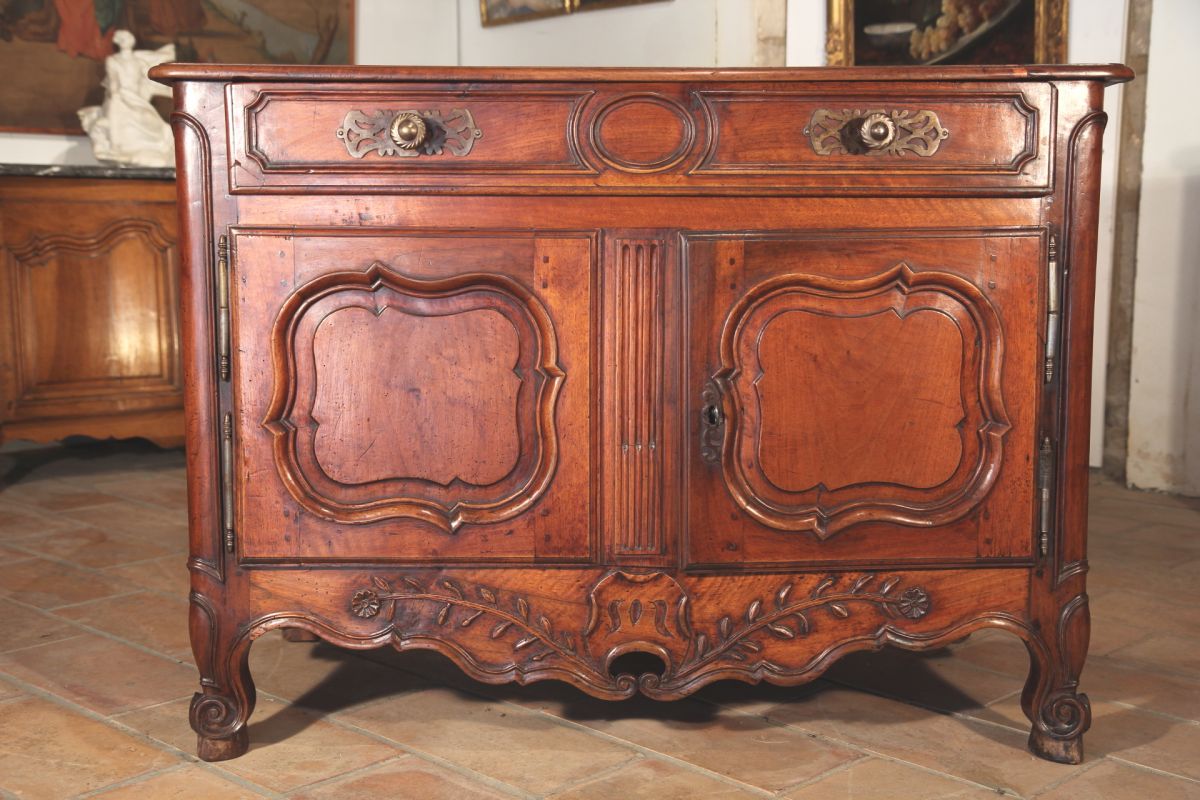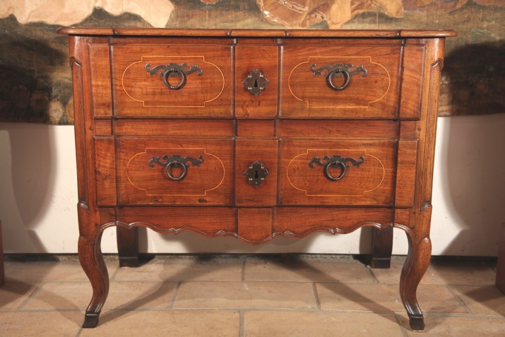 Early 18th C “sauteuse” Commode comprising 2 drawers. Round uprigths on cabriole legs ending in hoof feet. Fronts of drawers in “arbalète” (crossbow). Handles in wrougth iron, framed by typical cartouches in box wood filets. Walnut wood. From Provence (Aix).