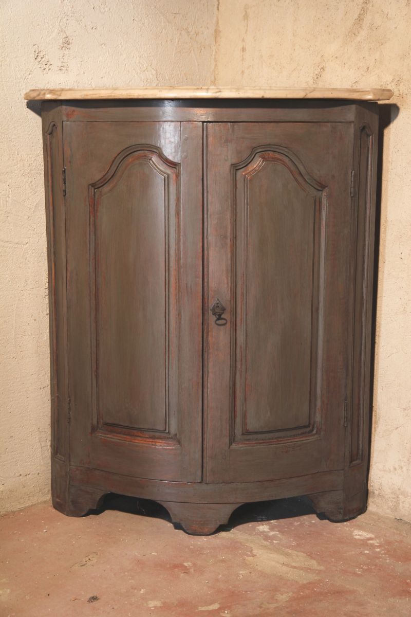 End of 18th C Louis XV “encoignure” (corner cabinet) comprising 2 doors, in painted wood. Top in Carrara marble. Front curved in “arbalète” (crossbow). From Provence.