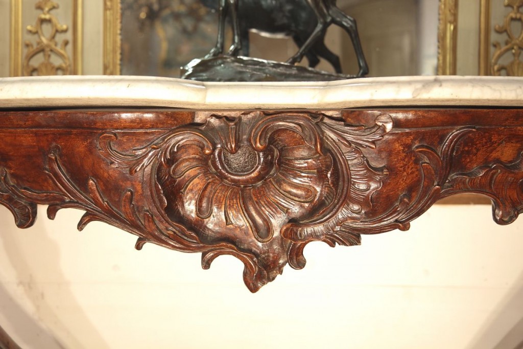 18thC Louis XV important console with 2 strongly arched legs linked by a brace. Carved Rocaille decoration with shells, acanthus leaves, lily flowers. Walnut wood. Carrara marble top. From Provence.