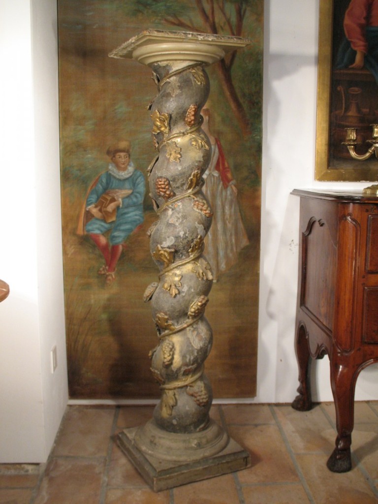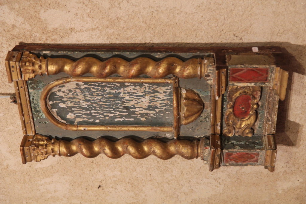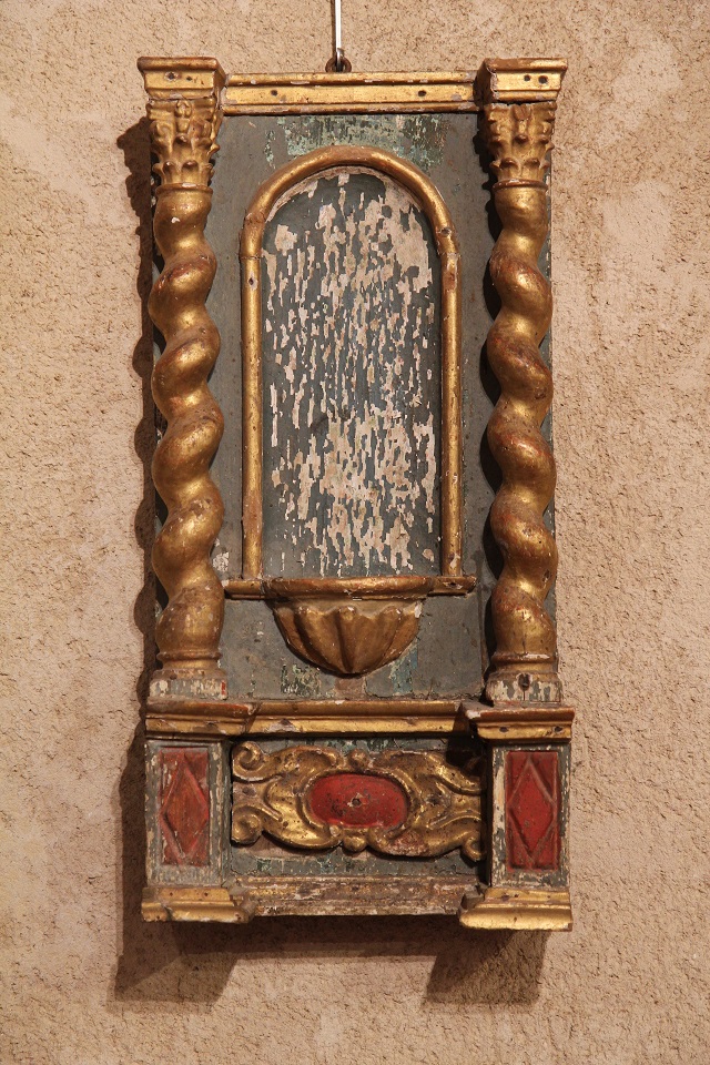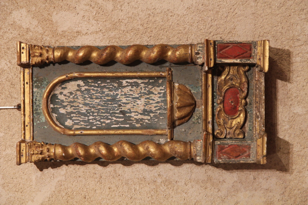 17thC small baroque altarpiece composed of 2 twisted columns on entablature framing a niche. In carved, gilt and polychrome wood.