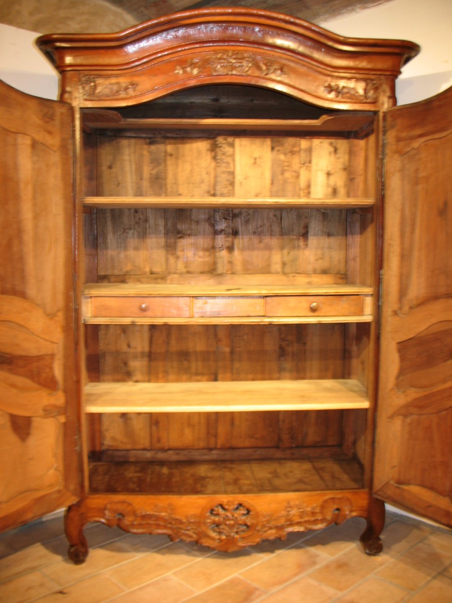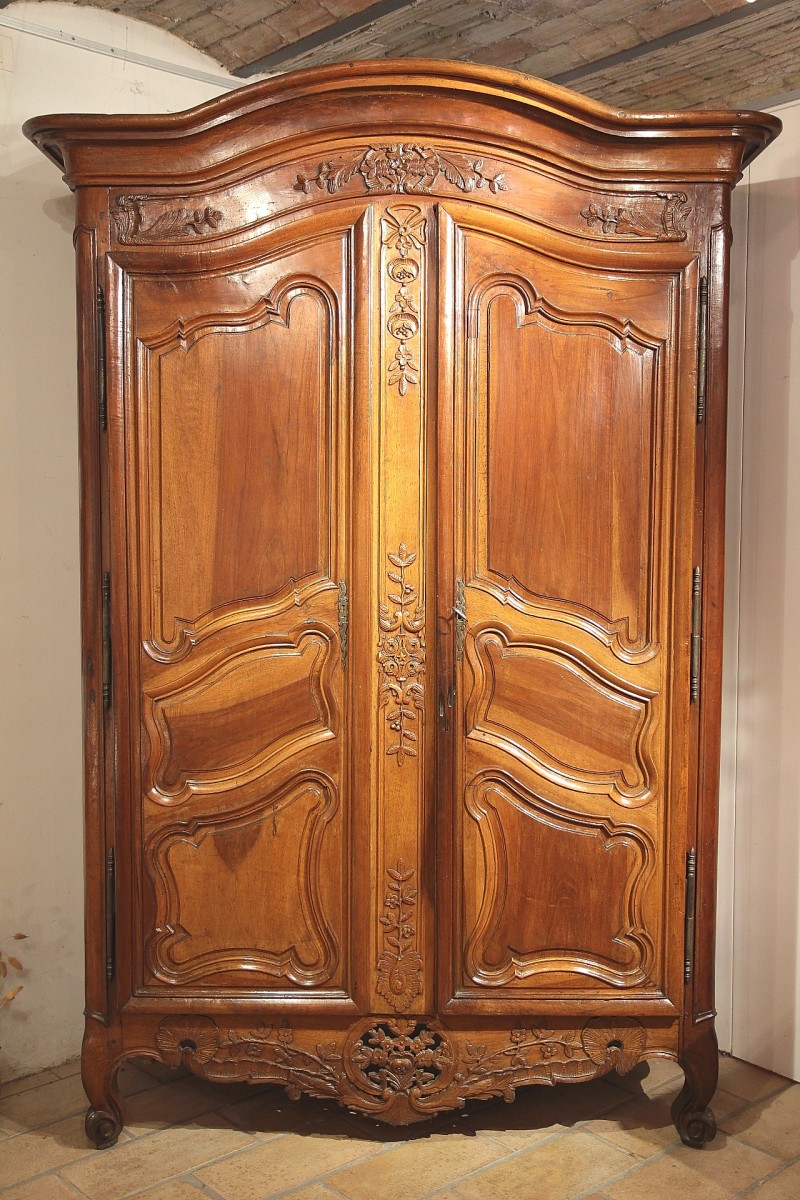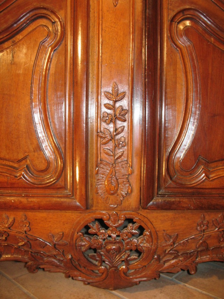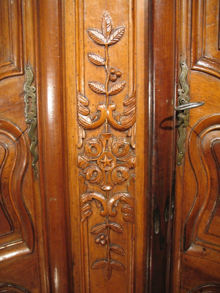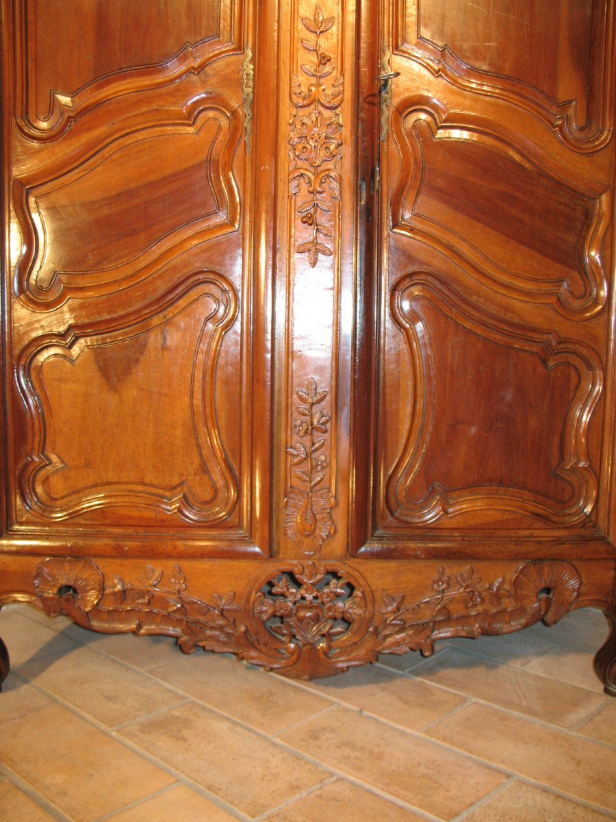 18thC marriage armoire, in walnut wood, from Provence. Doors comprising 3 panels with framing mouldings. “Chapeau de gendarme” cornice. Carved decoration of fruit and flowers (pomegranates, branches of nettle tree …). Pierce carved low apron with bride’s bouquet.