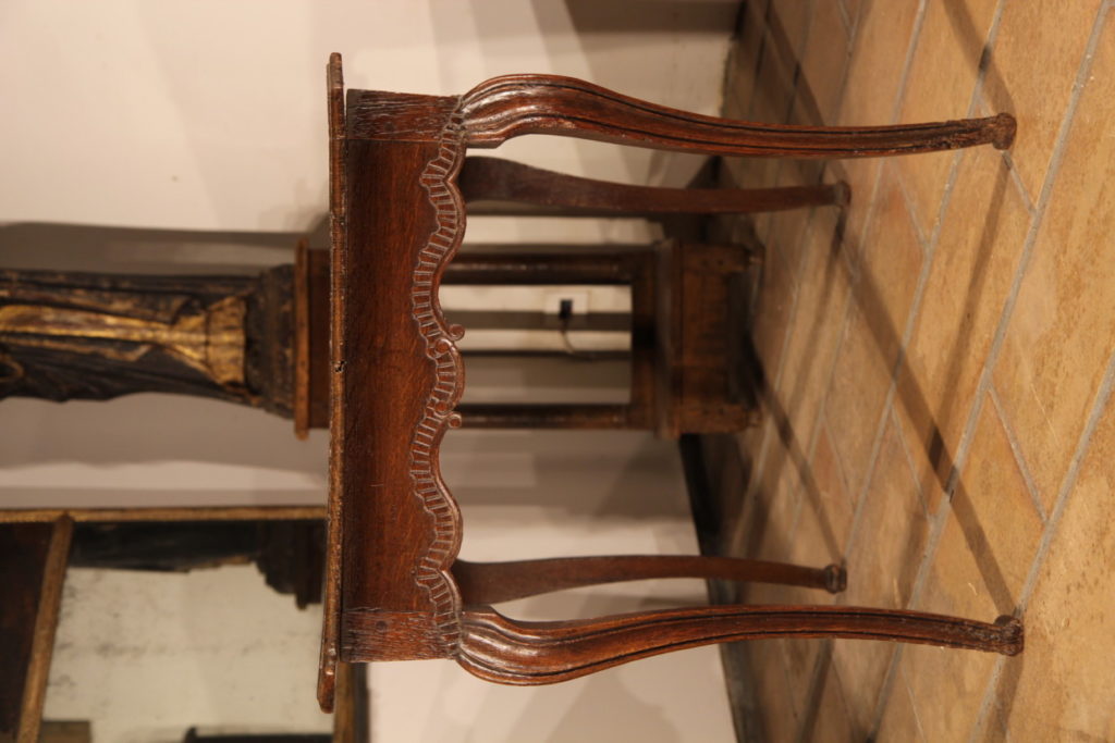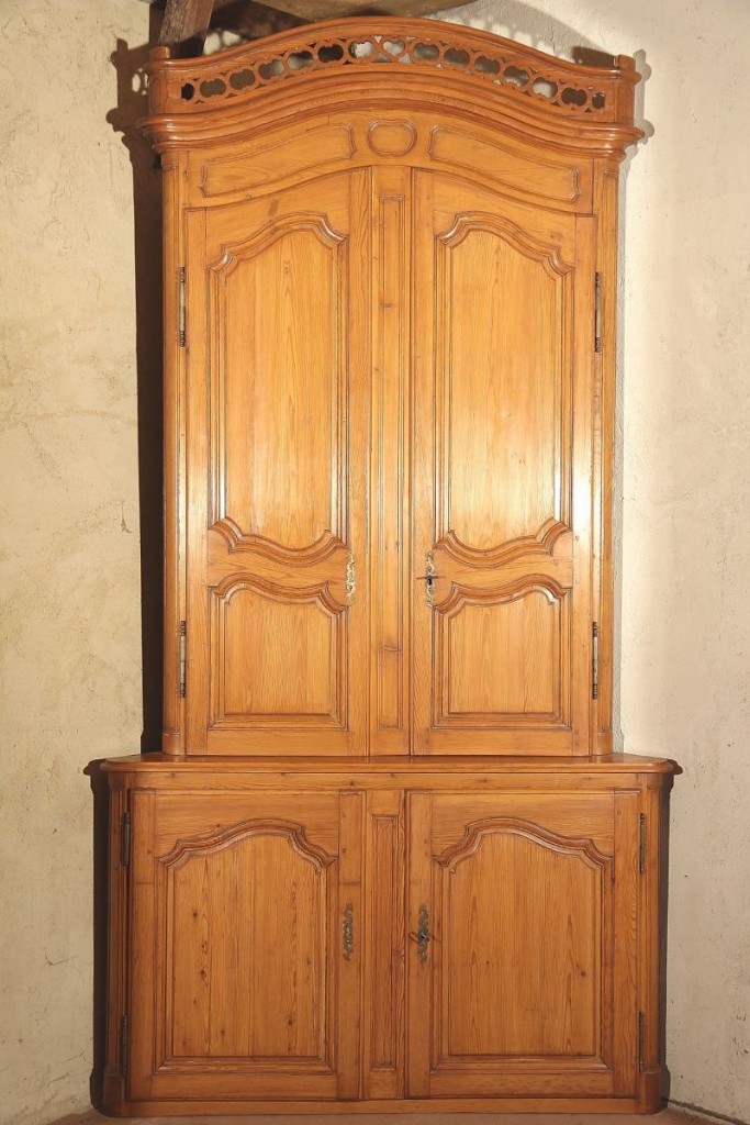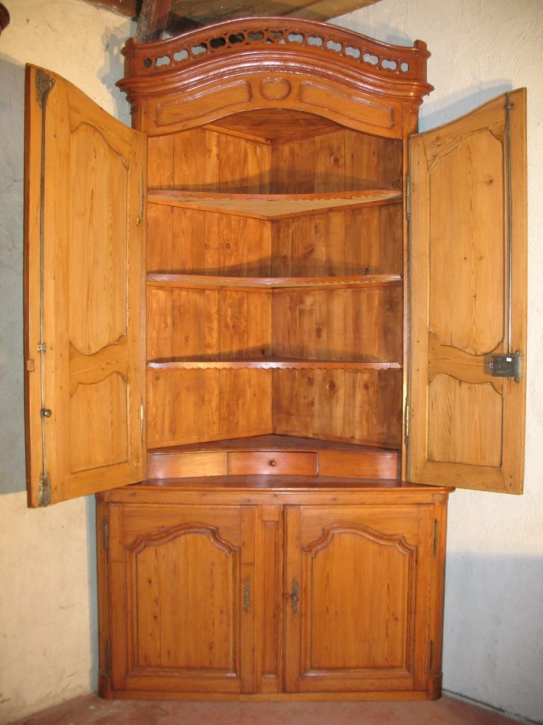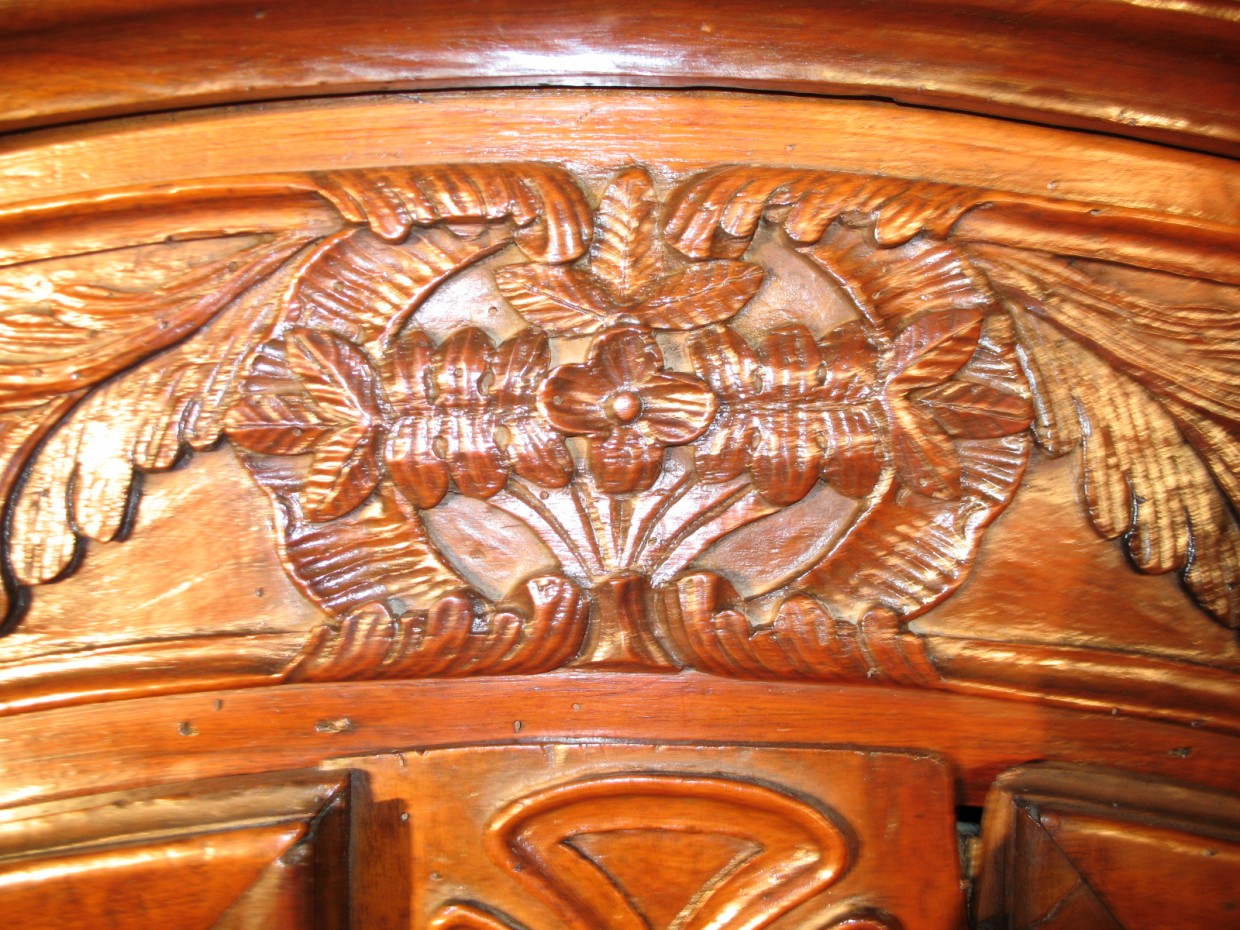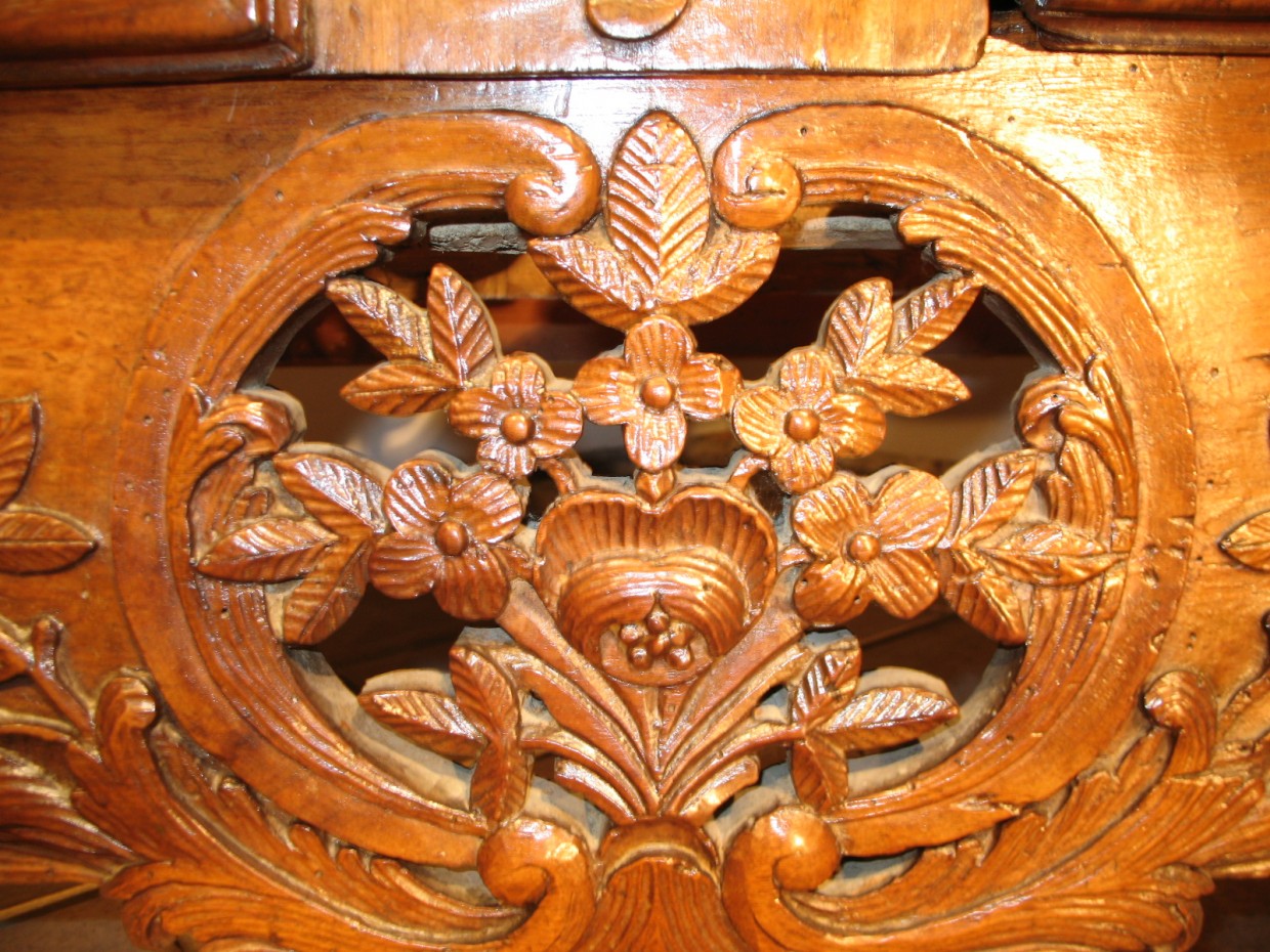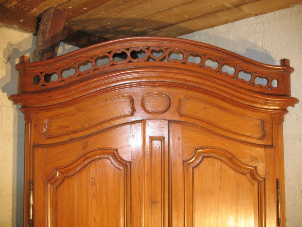 18thC marriage armoire, in walnut wood, from Provence. Doors comprising 3 panels with framing mouldings. “Chapeau de gendarme” cornice. Carved decoration of fruit and flowers (pomegranates, branches of nettle tree …). Pierce carved low apron with bride’s bouquet.